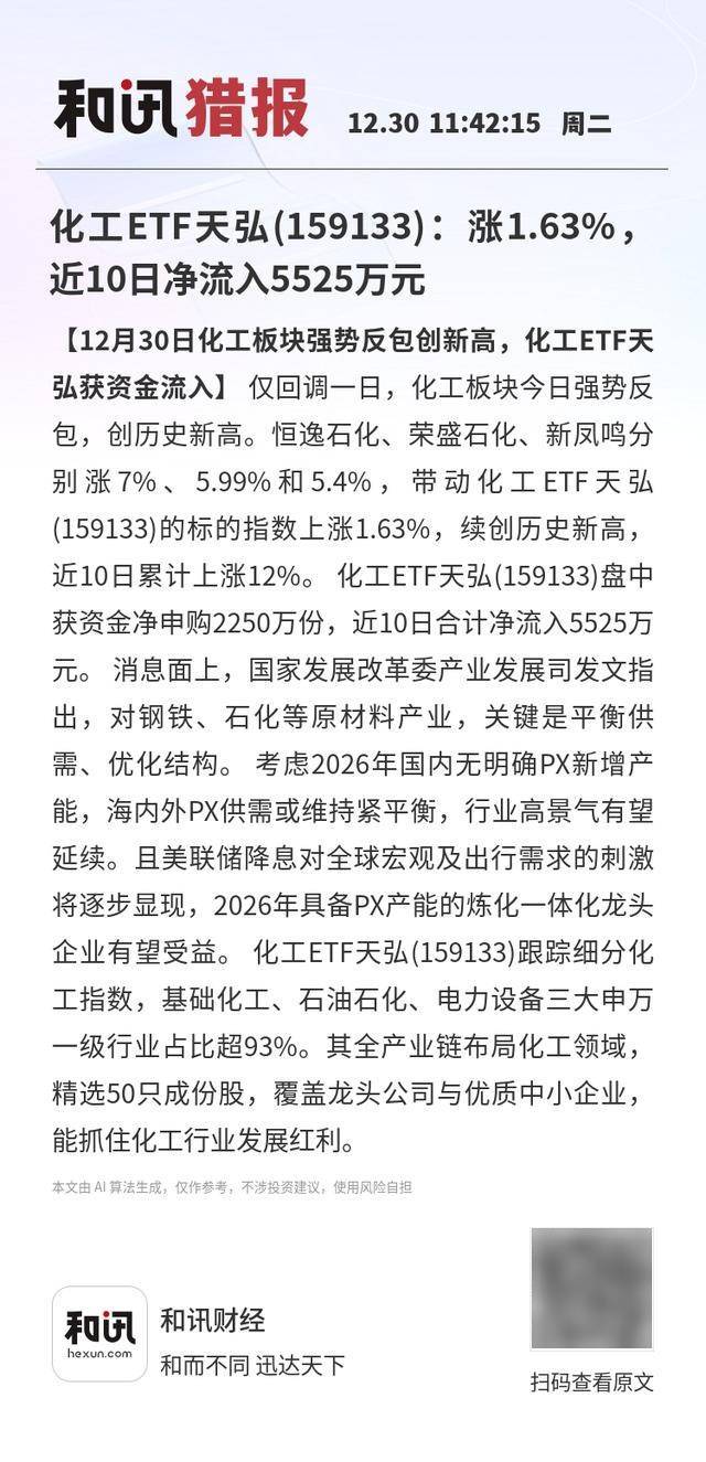 Group 1 - The chemical sector has rebounded strongly, reaching a historical high after a one-day pullback, with key stocks like Hengyi Petrochemical, Rongsheng Petrochemical, and New Fengming increasing by 7%, 5.99%, and 5.4% respectively [1] - The Tianhong Chemical ETF (159133) saw its underlying index rise by 1.63%, continuing to set historical highs, with a cumulative increase of 12% over the past 10 days [1] - The Tianhong Chemical ETF received a net subscription of 22.5 million units during the day, with a total net inflow of 55.25 million yuan over the last 10 days [1] Group 2 - The National Development and Reform Commission emphasized the importance of balancing supply and demand and optimizing the structure for raw material industries like steel and petrochemicals [1] - By 2026, there is no clear new PX production capacity expected domestically, which may lead to a tight balance in PX supply and demand both domestically and internationally, suggesting sustained high industry prosperity [1] - Integrated refining leaders with PX production capacity are expected to benefit from the macroeconomic stimulus effects of the Federal Reserve's interest rate cuts, which will gradually manifest [1] Group 3 - The Tianhong Chemical ETF tracks a segmented chemical index, with over 93% of its portfolio in three primary industries: basic chemicals, petroleum and petrochemicals, and electric power equipment [1] - The ETF has a full industry chain layout in the chemical sector, selecting 50 constituent stocks that cover both leading companies and quality small and medium enterprises, positioning itself to capture the development dividends of the chemical industry [1][3]