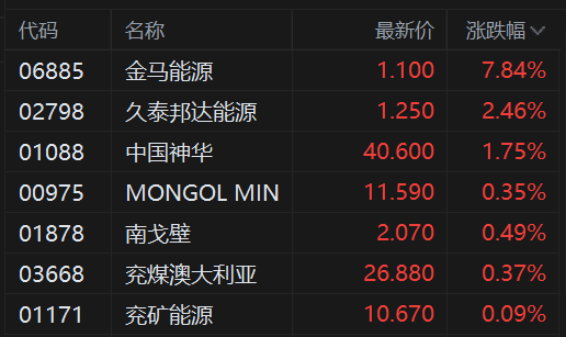 有分析称,2025年以来,煤炭股受累于煤价下降,108号文流向市场后,煤炭股悲观预期随即得到显著 缓释。反内卷趋势未变,4季度业绩仍有改善预期,若价格长期高位运行,26年业绩仍具备修复空间。 股价下跌强化红利价值,可逢低配置。 | 代码 | 名称 | 最新价 | 涨跌幅 ▽ | | --- | --- | --- | --- | | 06885 | 金马能源 | 1.100 | 7.84% | | 02798 | 久泰邦达能源 | 1.250 | 2.46% | | 01088 | 中国神华 | 40.600 | 1.75% | | 00975 | MONGOL MIN | 11.590 | 0.35% | | 01878 | 南戈壁 | 2.070 | 0.49% | | 03668 | 兖煤澳大利亚 | 26.880 | 0.37% | | 01171 | 兖矿能源 | 10.670 | 0.09% | 港股煤炭股继续活跃,其中,金马能源涨近8%,中国神华涨超2%录得3连涨行情,南戈壁、兖煤澳大 利亚、兖矿能源跟涨。 消息上,昨日,焦煤、焦炭期货多个合约涨停。国内部分焦企日前召开市场分析会,主动与钢厂沟通 ...