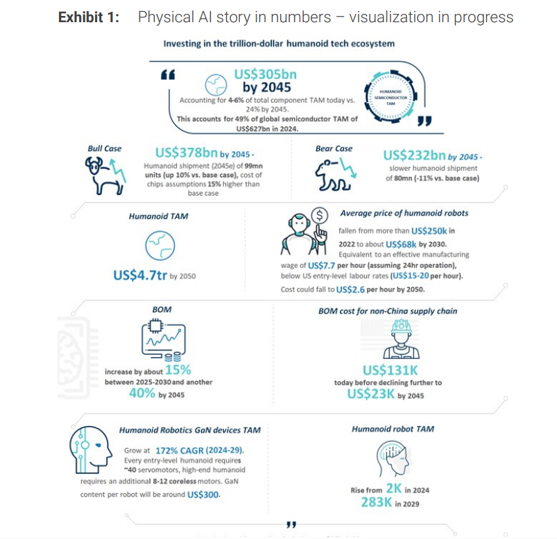 继生成式AI之后,人形机器人正被视为下一个颠覆性技术风口,一个潜在的万亿美元市场正在浮现。 据追风交易台消息,摩根士丹利在最新发布的深度报告——《人形机器人技术:把握未来》中指出,人形机器人作为"物理AI"(Physical AI)的 终极形态,标志着人类历史进入一个关键篇章。报告指出,到2050年全球人形机器人规模有望达5万亿美元,累计部署量将达10亿台。而在这一长 达数十年的增长中,半导体成为了最大的变量与增量。 报告测算,随着单台机器人的物料清单(BOM)成本从约13.1万美元降至2045年的2.3万美元,半导体在BOM中的成本占比将逆势大涨,从目前 的个位数飙升至24%。 报告估计,"非中国供应链下,目前一台人形机器人的平均BOM成本约为13.1万美元,但到2045年将降至2.3万美元"。这一成本远低于大多数发达 市场工人的年薪。到2050年,随着规模化和效率提升,每小时有效成本可能降至2.6美元,使其在经济上变得不可或缺。 到2050年,全球人形机器人市场规模将达到5万亿美元。 届时,全球累计部署量将达到10亿台,相当于"大约每10人拥有一台人形机器人"。 而人形机器人成本的下降将使人形机器人的投资 ...