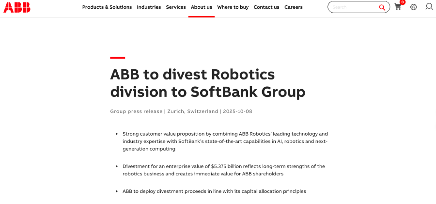 记者丨 邓浩 孙燕 编辑丨巫燕玲 工业机器人格局突变,软银AI版图再现扩张,砸钱"攻下"ABB robotics业务。一进一退之间, 背后是当前AI产业强者恒强,竞争趋烈的态势。 不同于以往在机器人领域以小博大的玩票试水,这次软银高达53.75亿美元 (约合383亿元人民 币)的重注,直接让ABB放弃了单独拆分机器人业务上市的计划。 而软银敢于如此激进的原因,或是孙正义对未来AI演进的乐观预期和担忧窗口缩紧的急迫落 子。 (图片来源:ABB官网) 不分拆了 10月8日,ABB宣布已签署协议将其机器人业务单元出售给软银集团,估值53.75亿美元,不再 推进此前拟定的机器人业务独立上市计划。该交易尚需获得监管机构批准并满足惯例成交条 件,预计将于2026年中后期完成。 作为工业机器人"四大家族"之一,ABB是全球装机量最大的工业机器人供货商。2024年, ABB机器人业务销售收入为23亿美元,约占ABB集团总收入的7%,运营息税折旧及摊销前利 润率为12.1%。 今年4月,ABB发布消息称,决定对其机器人业务单元实施100%分拆,目标于2026年第二季 度,推动该业务作为独立上市公司启动上市交易。 "如果追溯过往 ...