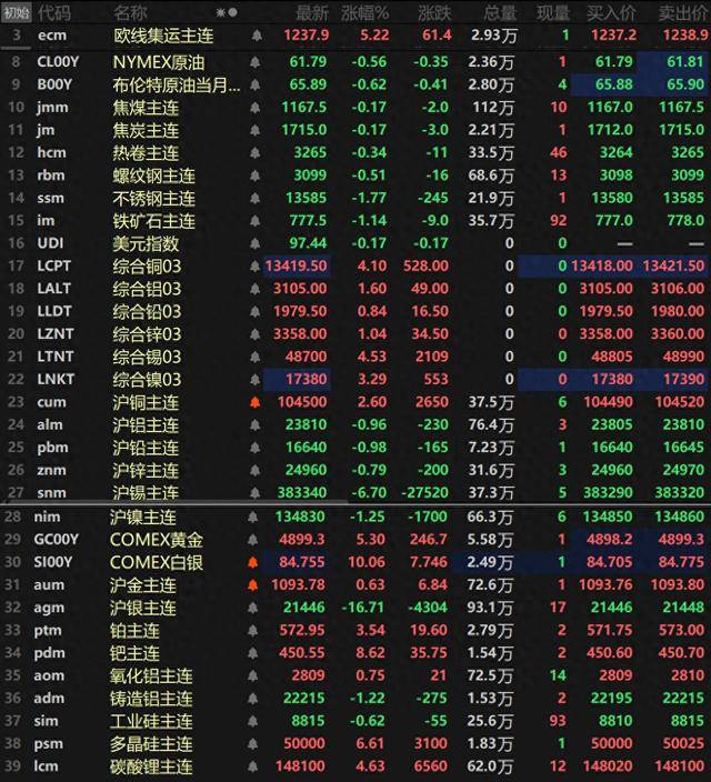 来源:上海有色网 截至日间收盘,内盘基本金属普跌,仅沪铜唯一上涨,涨幅达2.6%。沪锡以6.7%的跌幅领跌,沪镍跌 1.25%,其余金属跌幅均在1%以内。氧化铝主连涨0.75%,铸造铝主连跌1.22%。 此外,碳酸锂主连涨4.63%,多晶硅主连涨6.61%。工业硅主连跌0.62%。欧线集运主连涨5.22%报 1237.9。 黑色系方面集体下跌,不锈钢、铁矿一同跌超1%,不锈钢跌1.77%,铁矿跌1.14%。其余品种跌幅均在 1%以内。双焦方面,焦煤、焦炭一同跌0.17%。 外盘方面,截至15:09分,外盘基本金属集体上涨,且除了伦铅之外,涨幅均在1%以上。伦铜、伦锡一 同涨逾4%,伦铜涨4.1%,伦锡涨4.53%。伦镍涨3.29%,伦铝、伦锌涨逾1%,伦铝涨1.6%,伦锌涨 1.04%。伦铅涨0.84%。 贵金属方面,截至15:09分,COMEX黄金涨5.3%,COMEX白银涨10.06%。国内方面,沪银跌 16.71%。沪金涨0.63%。 此外,铂主连涨3.54%,钯主连涨8.62%。 截至今日15:09分行情 | 初始 代码 | | 名称 | * @ | 最新 | 涨幅% | 消费失 | 应置 | 现量 ...