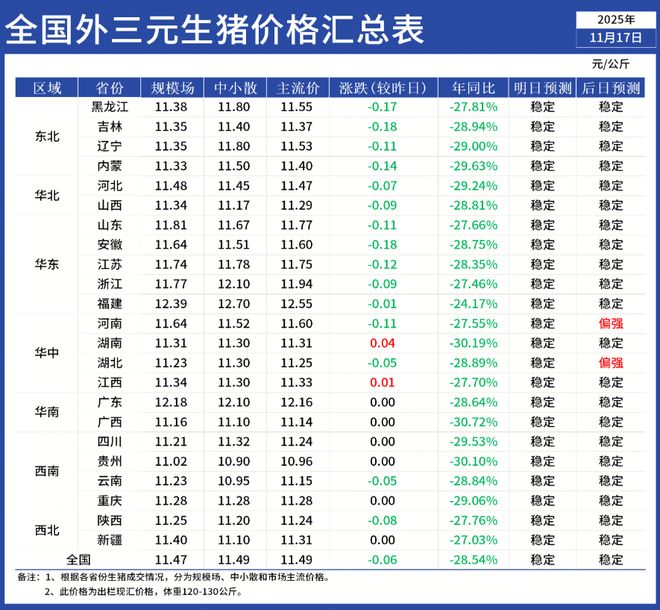 来源:市场资讯 (来源:南京玛合雅) 一、【市场关注】 二、【每日外三元生猪现货报价和明日走势预测】 | 全国外三元生猪价格汇总表 | | | | | | | | 2025年 | | --- | --- | --- | --- | --- | --- | --- | --- | --- | | | | | | | | | | 11月17日 | | | | | | | | | | 元/公斤 | | 区域 | 价份 | 规模场 | 中小散 | 主流价 | 涨跌(较昨日) | 年同比 | 明日预测 | 后日预测 | | 黑龙江 | | 11.38 | 11.80 | 11.55 | -0.17 | -27.81% | 插连 | 橙莲 | | 吉林 | 东北 | 11.35 | 11.40 | 11.37 | -0.18 | -28.94% | 稳定 | 稳定 | | 辽宁 | | 11.35 | 11.80 | 11.53 | -0.11 | -29.00% | 稳定 | 稳定 | | 内蒙 | | 11.33 | 11.50 | 11.40 | -0.14 | -29.63% | 稳定 | 稳定 | | 河北 | ...