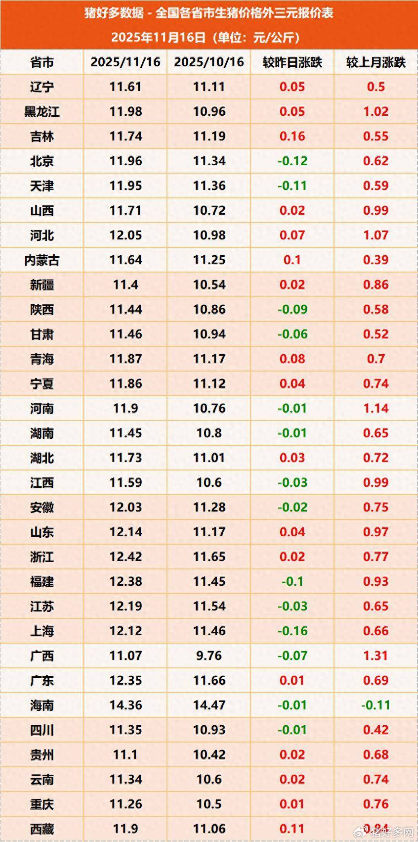 其一,二次育肥补栏体量下降。其实有好多次猪价上涨出乎养殖户预期,多半是二育的"功劳"。眼下二育一方面是政策端的不支持,另一方面主 要还是猪价承压,二育补栏积极性不高,进而对猪价支撑力度下降,且前期二育猪源正择机出栏,也会限制后市猪价的反弹幅度。 其二,屠宰企业采购偏谨慎。国家级大数据中心监测显示,11月6-12日期间,全国屠宰企业开工均率为34.36%,环比下跌0.7%,较前一周下跌 0.24个百分点。这也说明屠企对高价猪源的接受度和采购意愿并不强。 来源:猪好多网 在当前猪市供需双增的情况下,市场供需博弈进一步加深,反映到猪价具体走势上,生猪行情持续的磨底震荡。值得关注的是,今日猪价止跌企 稳,东北、西北全域飘红,不过猪价上涨动力略显不足的迹象还是比较明显,单日反弹幅度大部分在0.10元/公斤以内。 | | | 猪好多数据 - 全国各省市生猪价格外三元报价表 | | | | --- | --- | --- | --- | --- | | | | 2025年11月16日 (単位: 元/公斤) | | | | 省市 | 2025/11/16 | 2025/10/16 | 较昨日涨跌 | 较上月涨跌 | | 辽宁 ...