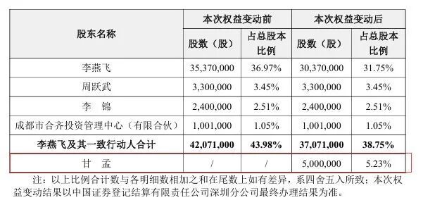 年仅30岁的药易购(SZ300937)新任董事甘孟,在加入公司仅3个多月后,便以个人名义斥资1.2亿元,揽入公司5.23%的股 份。 | 股东名称 | 本次权益变动前 | | 本次权益变动后 | | | --- | --- | --- | --- | --- | | | 股数(股) | 占总股本 比例 | 股数(股) | 占总股本 比例 | | 李声飞 | 35,370,000 | 36.97% | 30,370,000 | 31.75% | | 周跃武 | 3,300,000 | 3.45% | 3,300,000 | 3.45% | | 李 锦 | 2,400,000 | 2.51% | 2,400,000 | 2.51% | | 成都市合齐投资管理中心(有限合伙) | 1,001,000 | 1.05% | 1,001,000 | 1.05% | | 李燕飞及其一致行动人合计 | 42,071,000 | 43.98% | 37,071,000 | 38.75% | | 甘 孟 | 1 | | 5,000,000 | 5.23% | 图片来源:公告截图 根据11月10日晚的公告,甘孟以每股24元的价格, ...