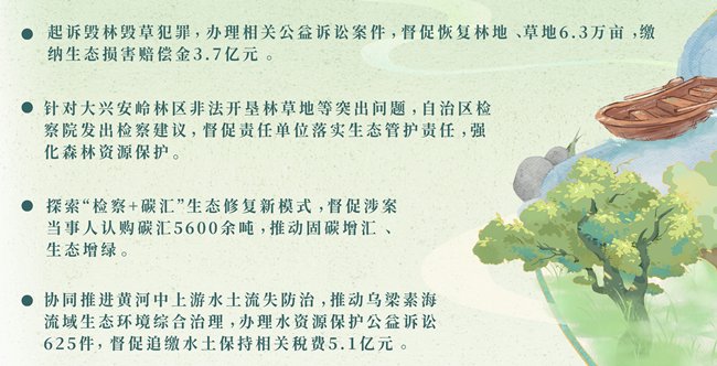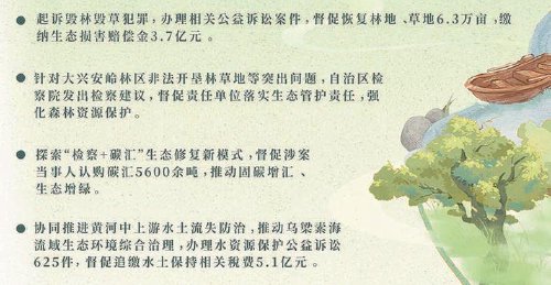 据了解,2025年,内蒙古检察机关牢记筑牢我国北方重要生态安全屏障这一"国之大者",坚持山水林田 湖草沙一体化保护和系统治理,锚定"三年一大变"目标,持续推进山林、河湖、草原"生态检察三大协 作统一行动",办理环境资源类案件6374件,同比上升50.3%。强化地、铁检察协作,扎实开展毁林毁 草违规违法行为集中整治,联合自治区高级法院、公安厅等出台证据指引等文件,统一执法司法标准, 起诉毁林毁草犯罪,办理相关公益诉讼案件,督促恢复林地、草地6.3万亩,缴纳生态损害赔偿金3.7亿 元。针对大兴安岭林区非法开垦林草地等突出问题,自治区检察院发出检察建议,督促责任单位落实生 态管护责任,强化森林资源保护。探索"检察+碳汇"生态修复新模式,督促涉案当事人认购碳汇5600余 吨。协同推进黄河中上游水土流失防治,推动乌梁素海流域生态环境综合治理,办理水资源保护公益诉 讼案件625件,督促追缴水土保持相关税费5.1亿元。强化荒漠化防治检察协作,办理防沙治沙、禁牧休 牧案件300件。 "检察机关着力服务美丽内蒙古建设,形成了'四大检察'互动、三大协作并行的生态保护检察模式。"全 国人大代表、内蒙古民族大学经济学院院长陈爱雪建议 ...