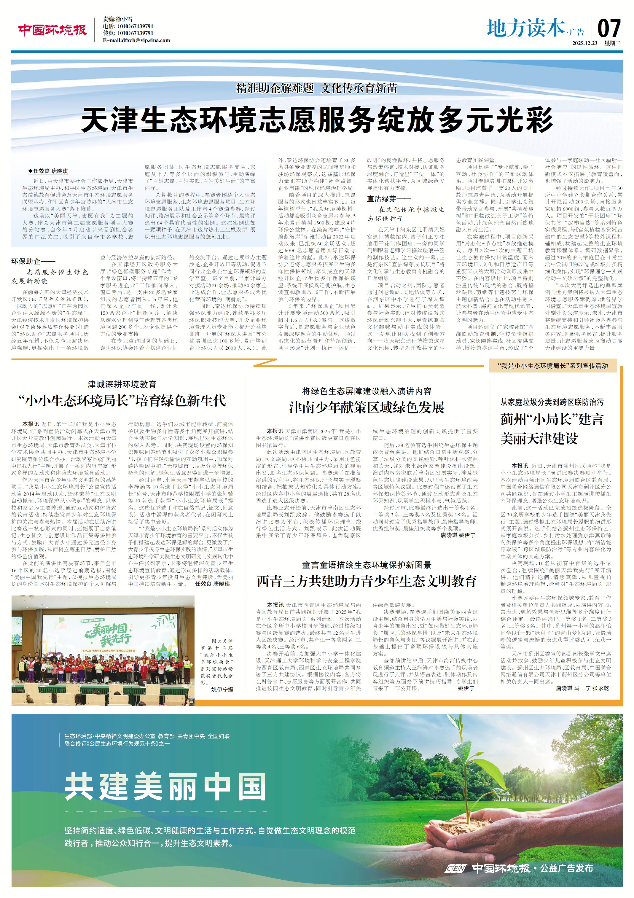 贡编:徐小雪 电话:(010)67139791 传真:(010)67139791 E-mail:dfxcb@vip.sina.com 精准功个解难题 天津生态环境志愿 ◆任效良 唐晓琪 近日,由天津市委社会工作部指导,天津市 生态环境局主办,和平区生态环境局、天津市生 态道德教育促进会及天津市生态环境志愿服务 联盟承办,和平区青少年宫协办的"天津市生态 环境志愿服务大赛"落下帷幕。 这场以"美丽天津,志愿有我"为主题的 大赛. 作为天津市第二届志愿服务项目大赛 的分站赛,自今年7月启动以来受到社会各 界的广泛关注,吸引了来自全市各学校、志 益与经济效益双赢的创新路径。 在天津经开区政务服务大 厅,"绿色低碳服务专庭"作为一 个常设窗口,将已持续五年的"专 家服务进企业"工作推向深入。 窗口背后,是一支由80多名专家 组成的志愿者团队。5年来,他 们深入企业车间一线,累计为 150 余家企业"把脉问诊",解决 从废水处理到废气治理等各类环 境问题200多个,为企业提供全 方位的专业支持。 在专业咨询服务的基础上, 泰达环保协会还着力搭建企业间 的交流平台。通过定期举办主题 沙龙、企业开放日等活动,促进不 同行业 ...