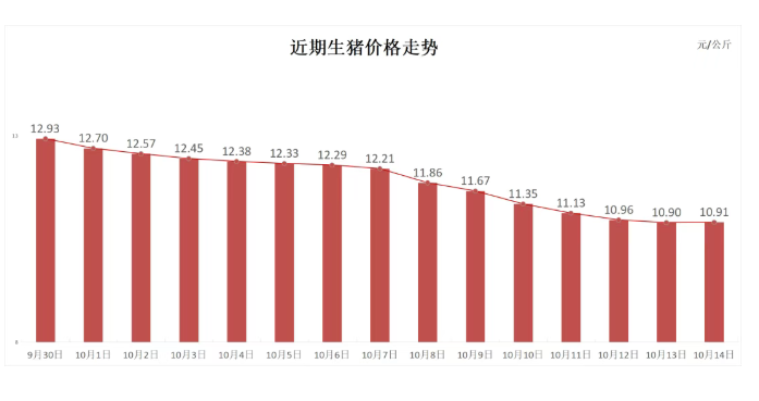 国家级生猪大数据中心:10月14日全国生猪均价10.91元/公斤 环比上涨0.01元