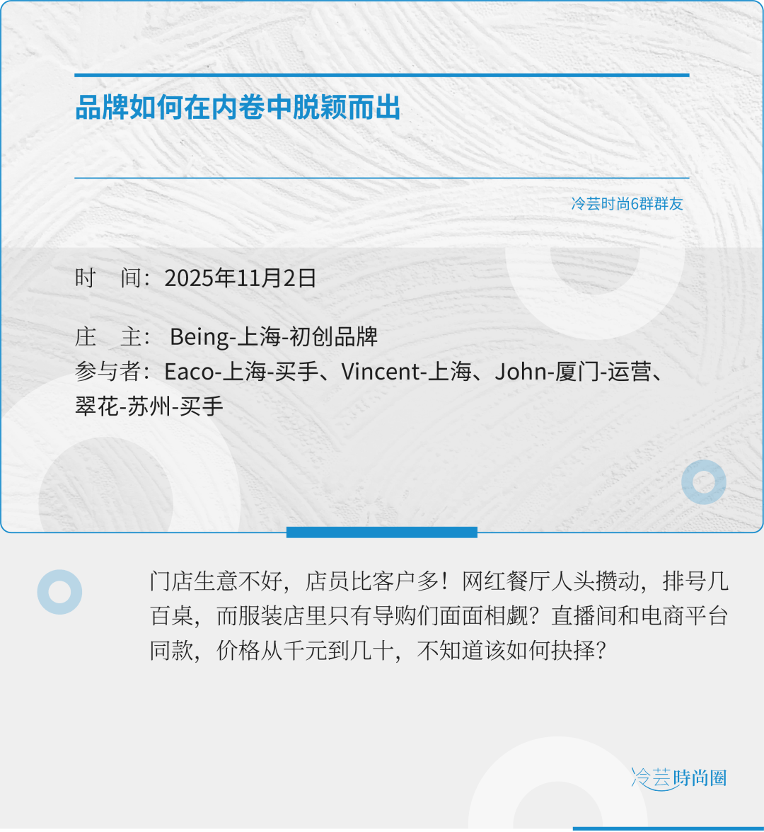 现在的购物中心去吃饭的人占大多数。网红餐厅的热闹提醒我们:大家永远愿意为美好的体验和社交价值付费。与之相对的是服装店里只有店员。 比如,有芸友去看了厦门海沧SM城市广场开业,当天有八万多的客流,餐饮甚至有些排队,但相对而言,服装零售店提袋率仍非常低。 庄主询问芸友他们有无想过通过门店装修改进来吸引客流。芸友表示有想过,但现在推动店铺装修整改要额外花钱,大家现在都不愿意做大投入。另外装 修如果只是小改动,无法让顾客有明确的感知;如果大动但货品不进行相应调整,客户即使进店了,发现货品和以前仍一样,也可能不太会买。 潮牌店 ▼以下的冷芸时尚圈讨论是就行业问题的讨论及总结。这些分享属于集体智慧的结晶。(它们并不代表冷芸个人观点)。希望通过此种方式能让更多行业 人士受益! 当下服装品牌生意现状? 1、大家分享各自业务现状 有芸友说现在杭州服装公司的日子都不好过,都在裁员,内卷也很厉害。 有位芸友的潮牌店虽然开在上海流量中心的位置,但是客流并不高。好在潮牌产品有二级市场可以炒价格,所以来买的人支付的客单价高,基本3000以上 的单占比大,这就可以平衡人流问题。 有芸友坐在红袖 hopeshow 门店门口观察40分钟,觉得 ...