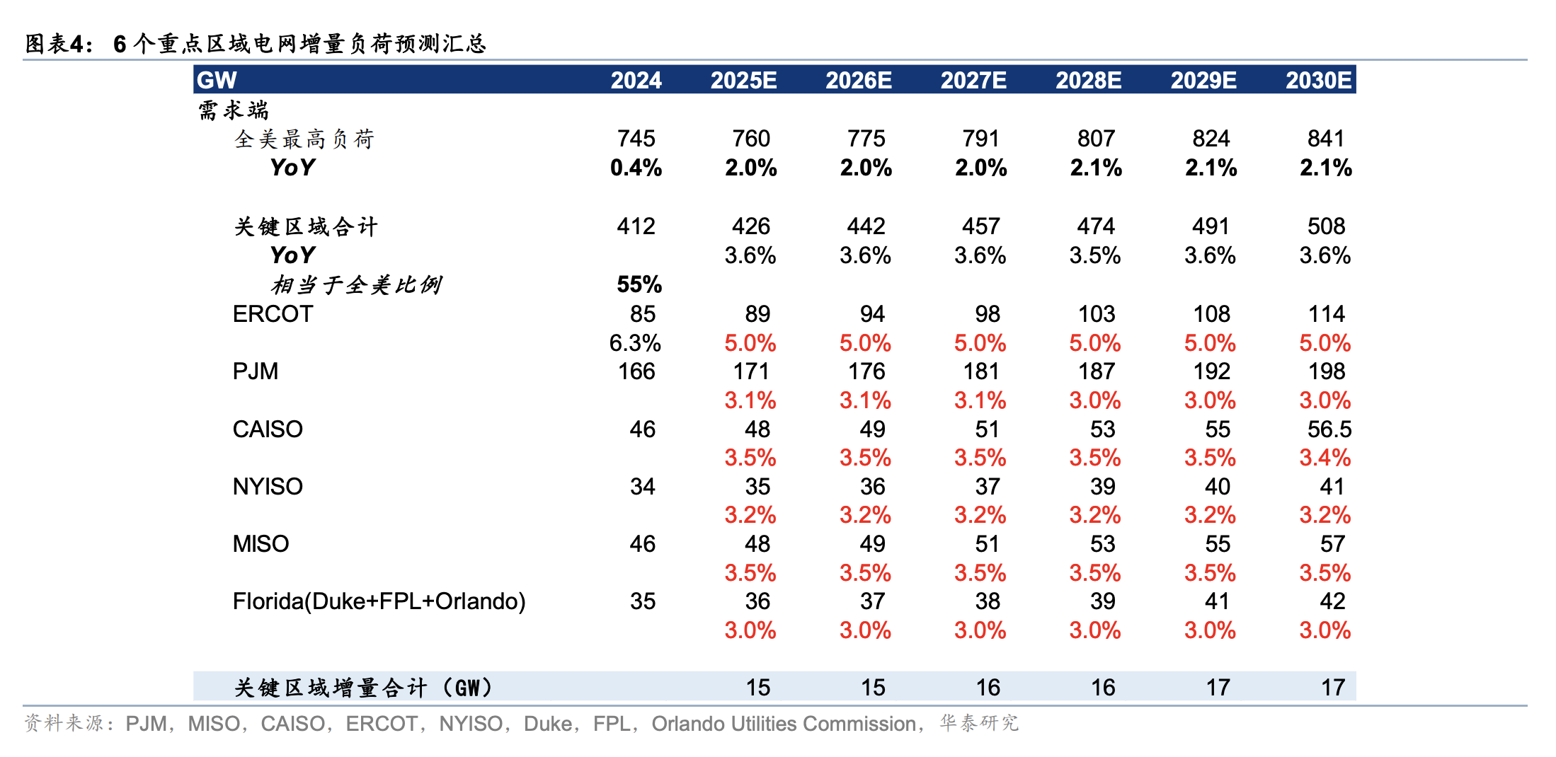 AI数据中心推动美国电力需求激增,储能或成关键解决方案。 华泰证券最新研究显示,人工智能数据中心(AIDC)正推动美国电力需求大幅增长,预计到2026年底将出现18-27GW的功率缺口。在传统电源建设周期偏长 的背景下,电化学储能有望成为缓解电力紧张的重要手段。 根据美国能源信息署(EIA)9月更新的数据,预测美国2025/26两年电量增速分别为2.3%/3.0%。华泰证券基于最新数据中心资本开支假设推算,25-26年美国本 土每年有望新增6-13GW的AIDC电力需求,远超历史增速。到2026年底,美国电力系统累计功率缺口可能达到18-27GW。 传统电源建设周期过长难以快速响应,而储能凭借1-1.5年的快速部署优势,有望成为被市场忽视但至关重要的解决方案。对投资者而言,这一趋势将推动 美国电化学储能需求保持50%以上增速,同时带动电芯企业、储能集成商、备用发电设备及燃料电池相关公司全面受益。 | GW | 2024 | 2025E | | --- | --- | --- | | 雷求端 | | | | 全美最高负荷 | 745 | 760 | | YoY | 0.4% | 2.0% | | 关键区域合计 ...