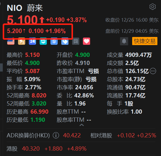 | NIO 蔚来 | | | | --- | --- | --- | | 5.100 + +0.190 +3.87% | | 收盘价 12/26 16:00 美东 | | 5.200↑ 0.100 +1.96% | | 盘前价 12/29 04:05 美东 | | 三五四年5月 | | ● 快捷交易 | | 最高价 5.150 | 开盘价 4.900 | 成交量 4909.47万 | | 最低价 4.900 | 昨收价 4.910 | 成交额 2.5亿 | | 平均价 5.087 | 市盈率TM 亏损 | 总市值 126.15亿 (--) | | 振 幅 5.09% | 市盈率(静) 亏损 | 总股本 24.73亿 | | 换手率 2.77% | 市净率 24.056 | 流通值 90.47亿 | | 52周最高 8.020 | 委 比 42.86% | 流通股 17.74亿 | | 52周最低 3.020 | 量 比 1.96 | 色 主 1股 | | 历史最高 66.990 | 股息TTM -- | 换股比率 1.00 | | 历史最低 1.190 1 the | 股息率ITM -- | | | ADR换 ...