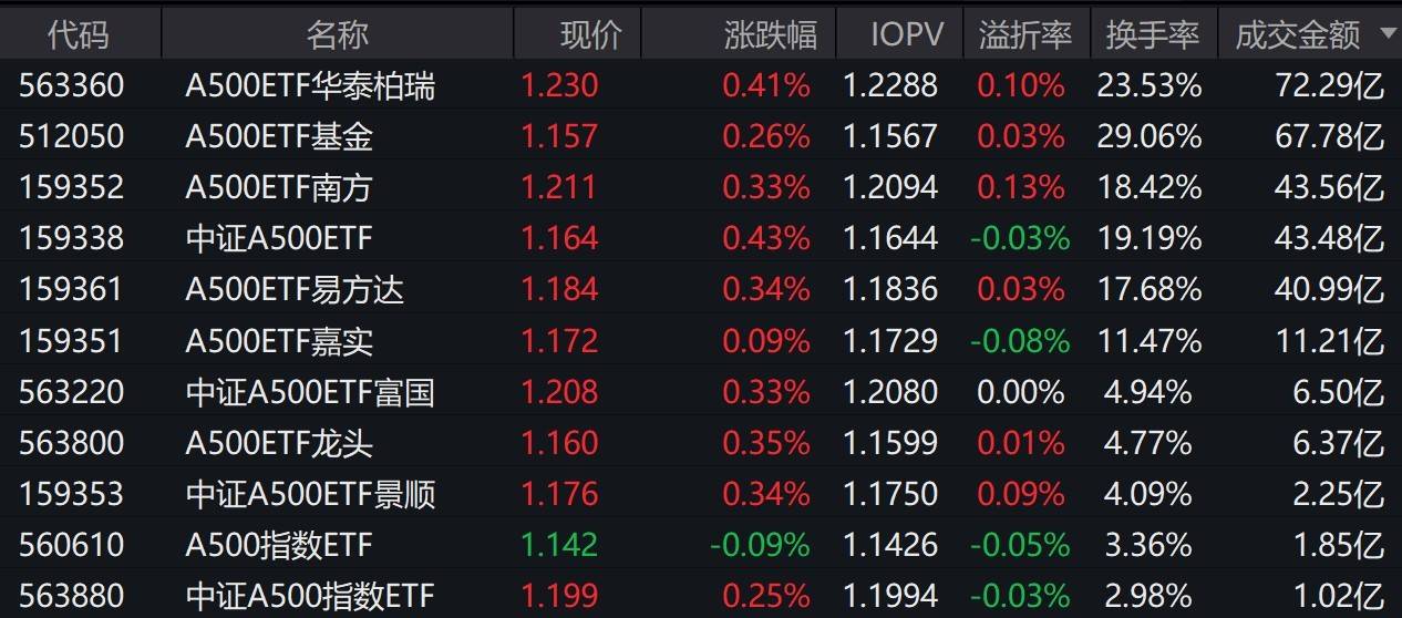 从板块来看,商业航天概念延续强势,算力硬件概念表现活跃,电网设备概念快速拉升;下跌方面,零售概念集体下挫。 市场早盘探底回升,创业板指盘中涨超1%,中证A500指数上涨0.39%。 | 代码 | 名称 | 现价 | 涨跌幅 | IOPV | 溢折率 | 换手率 | | --- | --- | --- | --- | --- | --- | --- | | 563360 | A500ETF华泰柏瑞 | 1.230 | 0.41% | 1.2288 | 0.10% | 23.53% | | 512050 | A500ETF基金 | 1.157 | 0.26% | 1.1567 | 0.03% | 29.06% | | 159352 | A500ETF南方 | 1.211 | 0.33% | 1.2094 | 0.13% | 18.42% | | 159338 | 中证A500ETF | 1.164 | 0.43% | | 1.1644 -0.03% 19.19% | | | 159361 | A500ETF易方达 | 1.184 | 0.34% | | 1.1836 0.03% 17.68% | | | 1593 ...