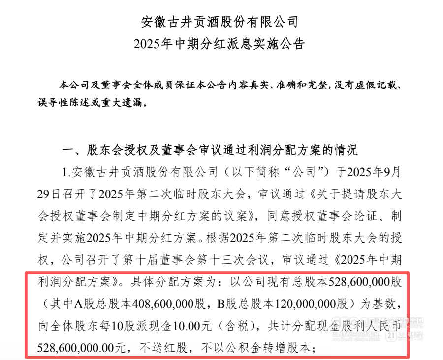 21世纪经济报道记者肖夏 综合报道 头部白酒的红包正在陆续到账。 2月1日下午,古井贡酒(000596)披露了2025年中期派息实施报告,以公司现有总股本5.286亿股为基数,向全体股东每10股派 10元人民币现金,共计5.286亿元。 这笔中期分红总额与去年的中期分红一致,将在2月10日实施,最迟买入时间为2月9日,意味着古井贡酒的股东们将在马年春节 前收到这份"红包"。 近年消费股纷纷响应监管呼吁提高分红,通过提升回报来吸引投资者。盈利能力较强、但高增长期暂告一段落的白酒股尤其跑 在前头。 21世纪经济报道记者注意到,在古井贡酒之前,贵州茅台(600519)、五粮液(000858)、泸州老窖(000568)分别在2025年 12月10日、2026年1月24日实施了2025年度的中期分红,分别分红300亿元、100亿元、19.99亿元。算上古井贡酒后,四家头部白 酒的本轮中期分红总额合计将超过425亿元。 由于去年白酒板块整体业绩进一步下行,投资者开始关注:白酒股的分红能否持续?账上钱够分吗? 去年春节前,六大头部白酒共计分红超过490亿元。目前山西汾酒(600809)、洋河股份(002304)尚未提出20 ...