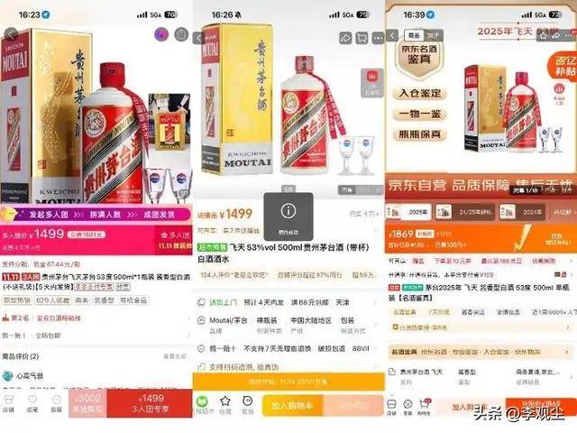 这场从年中延续至今的价格下行潮,在购物节的催化下愈演愈烈,正在改写高端白酒的市场规则。 双十一茅台价格大跳水 11月4日,各大电商平台的白酒促销战进入白热化阶段,53度500ml飞天茅台的价格成为最大焦点。 中国基金报记者在拼多多平台看到,这款核心单品经过"百亿补贴"后,价格直接降至1590元/瓶,单瓶补贴金额高达397元。 更具吸引力的是双瓶装规格,补贴后总价跌至3150元,折算下来单瓶仅1575元,创下近期市场成交价的新低。 不过并非所有平台都跟进了这场低价竞赛,淘系平台的飞天茅台售价仍维持在1640元/瓶,未参与大规模补贴,京东自营店的价格则更高,保持在 1899元/瓶的水平,与拼多多的价差超过300元。 2025年"双十一"大促正酣,高端白酒市场却传来震动性消息,53度飞天茅台价格再度下探,部分电商平台补贴后单价跌破1600元大关。 作为白酒行业的"风向标",飞天茅台的价格波动从来都不只是单一商品的行情变化,背后牵动着电商平台的流量博弈、线下酒商的生存焦虑以及整 个白酒行业的渠道变革。 值得注意的是,电商的低价已形成"价格倒挂",11月4日酱酒平台"不二酱"的数据显示,2025年飞天茅台散瓶的酒商调货 ...