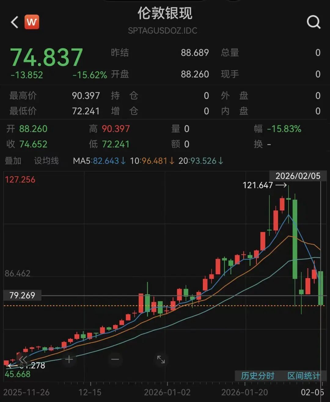 Core Viewpoint - The silver market has experienced significant volatility, with sharp declines in prices following a brief period of recovery, indicating potential instability in the sector [1][3]. Group 1: Price Movements - On February 6, spot silver prices fell by 18%, dropping below $73 per ounce, while New York silver futures decreased by 14% [1]. - As of the latest report, spot silver was down over 15% at $74.84 per ounce, and New York silver futures were down over 13% at $72.78 per ounce [1]. Group 2: Recent Trends - Since January 29, international silver prices have seen a continuous decline over three days, followed by a brief rebound on February 3 and 4, where spot silver reached as high as $92 per ounce [3]. - The significant drop on February 5 suggests that participants who entered the market during the recent rebound without timely exits may face losses [3].