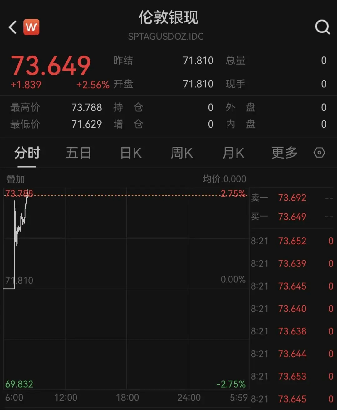 12月26日早间,现货白银跳空高开,突破73美元/盎司,再创历史新高。截至发稿,报73.649美元/盎司,涨2.56%。 | W | | | 伦敦银现 | | | | | | --- | --- | --- | --- | --- | --- | --- | --- | | | | | SPTAGUSDOZ.IDC | | | | | | 73.649 | | 昨结 | 71.810 | 总量 | | | O | | +1.839 | +2.56% 开盘 | | 71.810 | 现手 | | | 0 | | 最高价 | 73.788 | 持 仓 | 0 | Ar | 智 | | 0 | | 最低价 | 71.629 | 壇 仓 | 0 | 内 | श्री | | O | | 十日本 | 五日 | 日K | 居く | 月K | | 原因 | | | 鲁加 | | | | 均价:0.000 | | | | | 73.788 --- | | | | --------2.75%- | द्रो | 73.692 73.649 | | | | | | | | 8:21 | 73.652 | O | | | | | ...