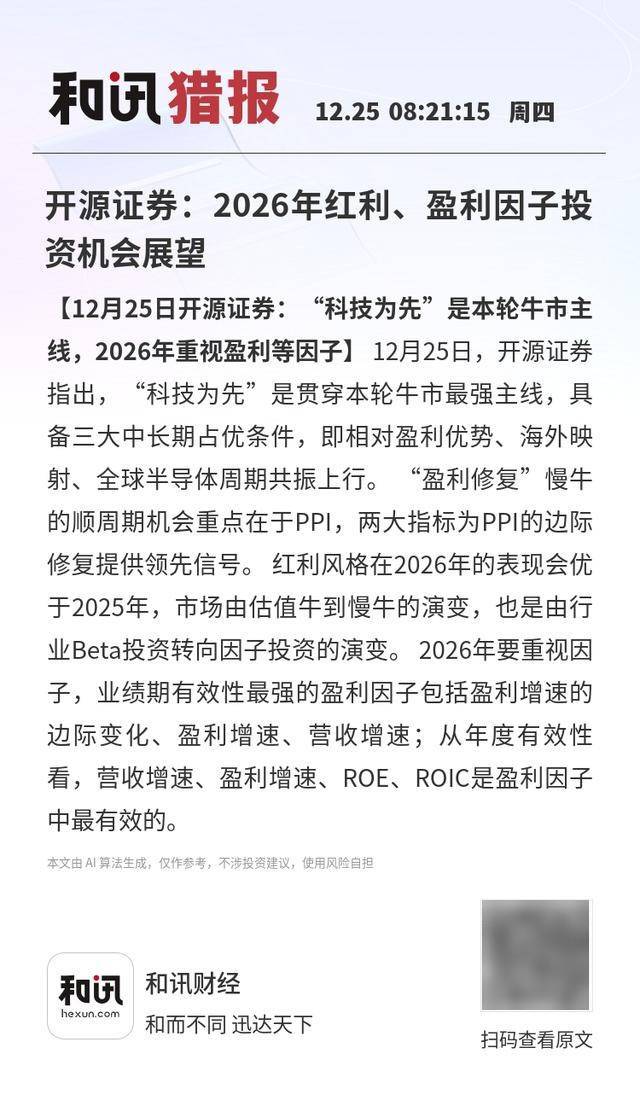 本文由 AI 算法生成,仅作参考,不涉投资建议,使用风险自担 【12月25日开源证券:"科技为先"是本轮牛市主线,2026年重视盈利等因子】12月25日,开源证券指 出,"科技为先"是贯穿本轮牛市最强主线,具备三大中长期占优条件,即相对盈利优势、海外映射、全 球半导体周期共振上行。 "盈利修复"慢牛的顺周期机会重点在于PPI,两大指标为PPI的边际修复提供 领先信号。 红利风格在2026年的表现会优于2025年,市场由估值牛到慢牛的演变,也是由行业Beta投 资转向因子投资的演变。 2026年要重视因子,业绩期有效性最强的盈利因子包括盈利增速的边际变 化、盈利增速、营收增速;从年度有效性看,营收增速、盈利增速、ROE、ROIC是盈利因子中最有效 的。 本文由 Al 算法生成,仅作参考,不涉投资建议,使用风险自担 和讯财经 hexun.con 和而不同 迅达天下 扫码查看原文 ...