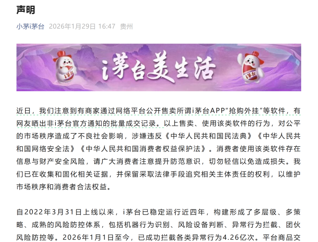 【导读】一个月拦截异常4.26亿次,i茅台发布关于"外挂抢购"的声明 刚刚,i茅台发布声明,对商家通过网络平台公开售卖所谓i茅台App"抢购外挂"等软件的行为进行严厉谴责与坚决抵制。 i茅台指出,近期发现有商家售卖相关抢购类软件,甚至有网友晒出非官方的批量成交记录,此类售卖、使用行为破坏公平市场秩序,造成不良社会影 响,还涉嫌违反《中华人民共和国民法典》《中华人民共和国网络安全法》《中华人民共和国消费者权益保护法》。平台特别提醒,消费者使用该类软件 存在信息泄露、财产受损的安全风险,呼吁广大消费者增强防范意识,切勿轻信相关软件以免蒙受损失。目前i茅台已全面收集并固化相关违规证据,将 保留采取法律手段追究相关主体责任的权利,坚决维护正常市场秩序和消费者合法权益。 同时,i茅台透露,平台已构建多层级、多策略的成熟风险防控体系,2026年1月1日以来已成功拦截各类异常行为4.26亿次,平台交易中不存在批量非常 规成交的情况,后续还将持续提升技术防控能力,为消费者营造公平有序的消费环境。 近日,在二手平台上,声称能提升i茅台抢购成功率的"外挂"软件及教程正公开售卖,形成了一条灰色产业链。 在多个二手交易平台上,商家以 ...