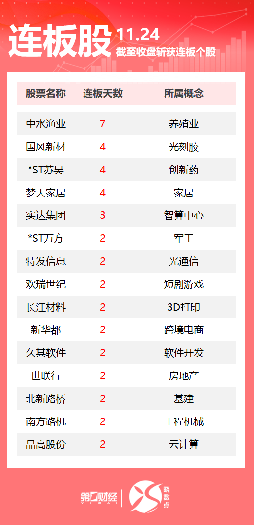 光刻胶板块国风新材4连板,3D打印概念股长江材料2连板。一图速览今日连板股>> A11.24 载 | 元 | V | 股票名称 | 连板天数 | 所属概念 | | --- | --- | --- | | 三思名出 | 7 | 赤殖V | | 国风新材 | 4 | 光刻胶 | | *ST苏吴 | 4 | 创新药 | | 梦天家居 | 4 | 家居 | | 实达集团 | 3 | 智算中心 | | *ST万方 | 2 | 车工 | | 特发信息 | 2 | 光通信 | | 欢瑞世纪 | 2 | 短剧游戏 | | 长江材料 | 2 | 3D打印 | | 新华都 | 2 | 跨境电商 | | 久其软件 | 2 | 软件开发 | | 世联行 | 2 | 房地产 | | 北新路桥 | 2 | 基建 | | 南方路机 | 2 | 工程机械 | | 品高股份 | 2 | 云计算 | 11月24日,Wind数据显示,A股市场共计79只个股涨停。其中养殖业板块中水渔业收获7连板,光刻胶 板块国风新材4连板,3D打印概念股长江材料2连板。一图速览今日连板股>> ...