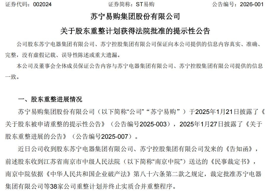 苏宁系的"自救"还在继续。 1月5日,ST易购(原简称苏宁易购,SZ:002024,股价1.71元,总市值158.43亿元)发布《关于股东重整计划获得法院批准的提示性公告》。公告提及,近 日公司收到股东苏宁电器集团有限公司、苏宁控股集团有限公司发来的《告知函》,前述股东收到江苏省南京市中级人民法院(以下简称南京中院)送达的 《民事裁定书》,南京中院依据《中华人民共和国企业破产法》第八十六条第二款之规定,裁定批准苏宁电器集团有限公司等38家公司重整计划并终止实质 合并重整程序。 苏宁易购发布的上述公告提及,根据南京中院裁定的《重整计划》,公司股东张近东(苏宁创始人)拟将其持有的公司未质押股票的收益权和已质押股票的 超额收益权,注入重整服务信托。 图片来源:苏宁易购公告 有市场观点据此认为,这意味着张近东为苏宁搏得一线生机押上了全部身家。 对此,香颂资本董事沈萌接受《每日经济新闻》记者采访时表示,押上全部身家的说法不准确,张近东是将在苏宁的股份全部作为债务重组的担保,"但他 的身家不一定只有苏宁的股份"。 张近东"净身"还债?重整计划执行期限为36个月 2025年1月26日,南京市中级人民法院分别裁定受理苏宁电器 ...
