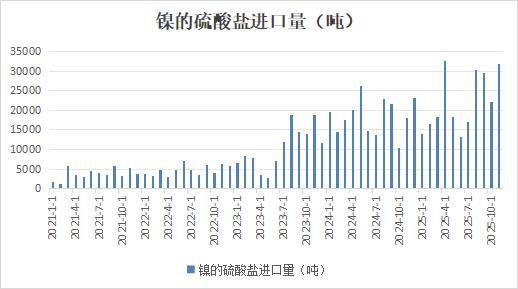 数据来源:海关总署 据海关总署数据显示,2025年11月中国镍的硫酸盐进口量为31818吨,环比增加9762吨,增幅44.3%; 同比增加13744吨,增幅76.0%。其中,印尼进口量为17935吨,韩国进口量为1529吨,芬兰进口量为 9090吨。 2025年1-11月中国镍的硫酸盐进口量累计243594吨,同比增幅22.1%。 ...