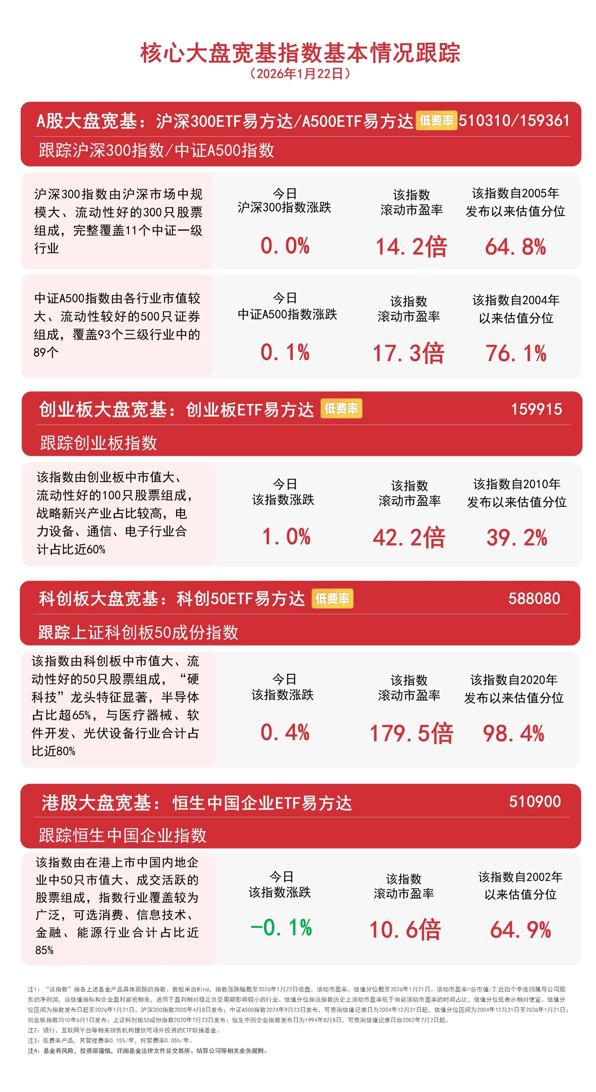 1月22日,市场午后震荡回升,A股三大指数集体翻红,三市成交额超2.7万亿元、较昨日放量近1000亿元,盘面上,市场热点快速轮动,全市场超3500只个 股上涨。板块题材上,油气开采及服务、军工装备、光伏设备、商业航天、建筑材料、煤炭开采加工、钢铁、草甘膦板块涨幅居前;保险、光刻机、贵金 属、电池、半导体、创新药板块表现落后;港股主要指数高开低走,大型科技股涨跌不一。 截至收盘,中证A500指数上涨0.1%,沪深300指数上涨0.01%,创业板指数上涨1.0%,上证科创板50成份指数上涨0.4%,恒生中国企业指数下跌0.1%。 1.0% 科创板大盘宽基:科创50ETF易方达 低费 跟踪上证科创板50成份指数 该指数由科创板中市值大、流 动性好的50只股票组成,"硬 科技"龙头特征显著,半导体 占比超65%,与医疗器械、软 件开发、光伏设备行业合计占 比近80% 今日 该指数涨跌 0. 4% 港股大盘宽基:恒生中国企业ETF易方 该指数由创业板中市值大、 流动性好的100只股票组成, 战略新兴产业占比较高,电 力设备、通信、电子行业合 计占比近60% 今日 该指数涨跌 每日经济新闻 跟踪恒生中国企业指数 该指数由 ...