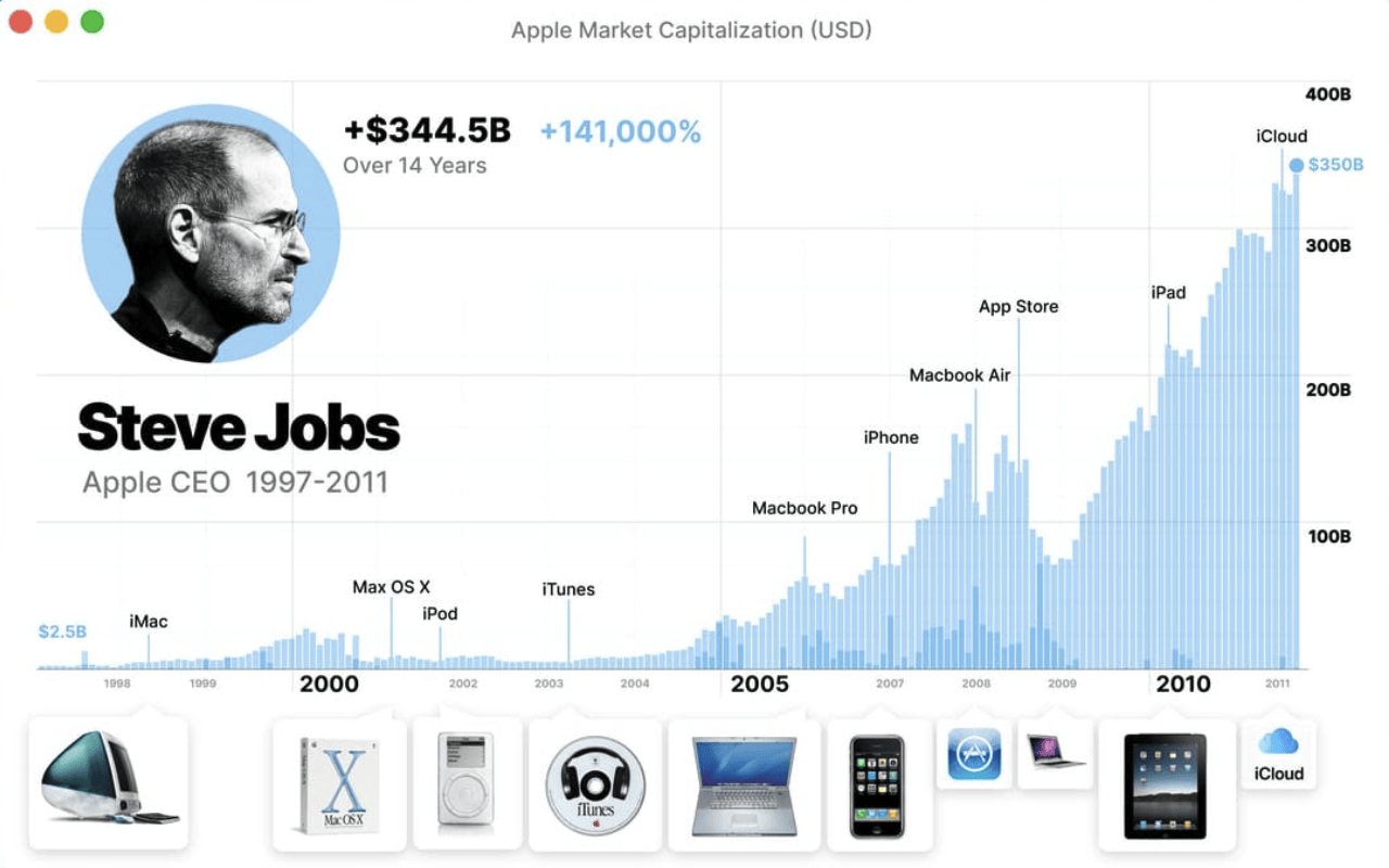 2011年10月,乔布斯去世;随后库克正式接管苹果帝国,截至目前,正好做了14年的CEO; 为什么说"正好"呢,因为乔布斯在1997年回归苹果后(之前被董事会赶走了)到去世前几个月,也掌舵了14年的苹果。 所以,两任CEO,同样的年限,还挺有对比效果的。当然,最直观的还是如图所见,产品发布&公司市值。 乔布斯时代(1997-2011),让苹果从濒临破产的2.5亿美元市值起步,到iMac、iPod、iPhone和iPad这些神级产品登场,苹果完美演绎了什么时"凤凰涅槃", 市值达到3445亿美元,增长率高达141,000%。 换句话说,如果你在乔布斯掌舵的任一时间买入苹果并持有至今,大概是10~100多倍的回报。 这也是乔布斯众所周知的魔力——不只是卖产品,而是售卖梦想与美学。 再说说厨子。ch 库克接棒后(2011至今),很多人觉得他太不"乔布斯"了,苹果失去了以往的创造力,但但实际上,乔布斯的遗产已经被推向巅峰。 苹果市值从3470亿美元暴增至超股票3.1万亿美元,增长了9,000%。 虽然这14年里没有iPhone、iPad这样的产品,但库克掌舵下也给出不少引领行业的东西: AirPods、Apple W ...