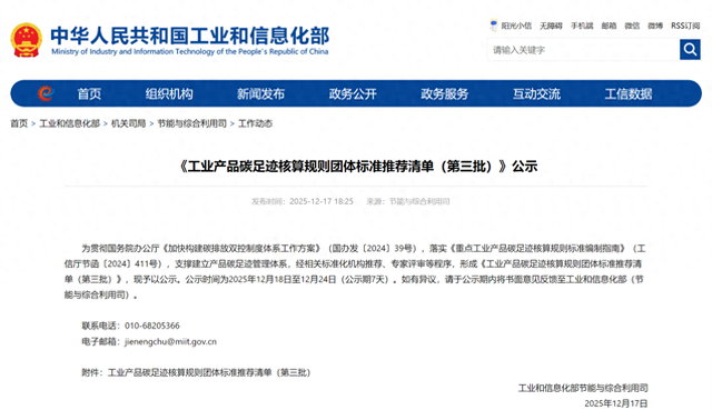 Core Viewpoint - The Ministry of Industry and Information Technology (MIIT) is enhancing the supply of carbon footprint accounting standards and actively promoting the formulation of carbon footprint accounting rules and standards for key industrial products [1] Group 1: Policy Implementation - The MIIT has issued an implementation plan to advance green and low-carbon standardization in the industrial and information sectors [1] - The focus will be on industrial products that have urgent market demand, significant emission reduction contributions, and notable supply chain driving effects [1] Group 2: Standard Development - The approach will follow the principle of trialing group standards first, which will gradually be transformed into industry or national standards [1] - There will be a steady and orderly expansion of the range of products covered, with the possibility of directly formulating national or industry standards when conditions are ripe [1] - Group standards with good implementation will be recognized as industry or national standards [1]