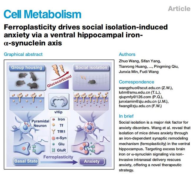 撰文丨王聪 编辑丨王多鱼 排版丨水成文 社交隔离 ( social isolation ) 是导致 焦虑症 ( anxiety disorder ) 的一个主要环境因素,但其背后的 神经生物学基础,目前仍不十分清楚。 2026 年 1 月 27 日, 浙江大学 王福俤 教授、 闵军霞 教授、华南理工大学 王卓 副教授、 南方医科大学 邱平 明 教授、 南方医科大学第三附属医院 吕田明 副教授等,在 Cell 子刊 Cell Metabiolism 上发表了题 为: Ferroplasticity drives social isolation-induced anxiety via a ventral hippocampal iron-α- synuclein axis 的研究论文。 该研究揭示了 社交隔离 会引发大脑中一种名为 " 铁可塑性 " ( Ferroplasticity ) 的变化,从而导致 焦 虑 症状。这项研究不仅解释了孤独感如何转化为焦虑,还提出了创新的预防和治疗方法。 孤独感的生物学基础 现代社会,越来越多的人面临 社交隔离 ( social isolation ) 的问题。世界卫生组织 ...