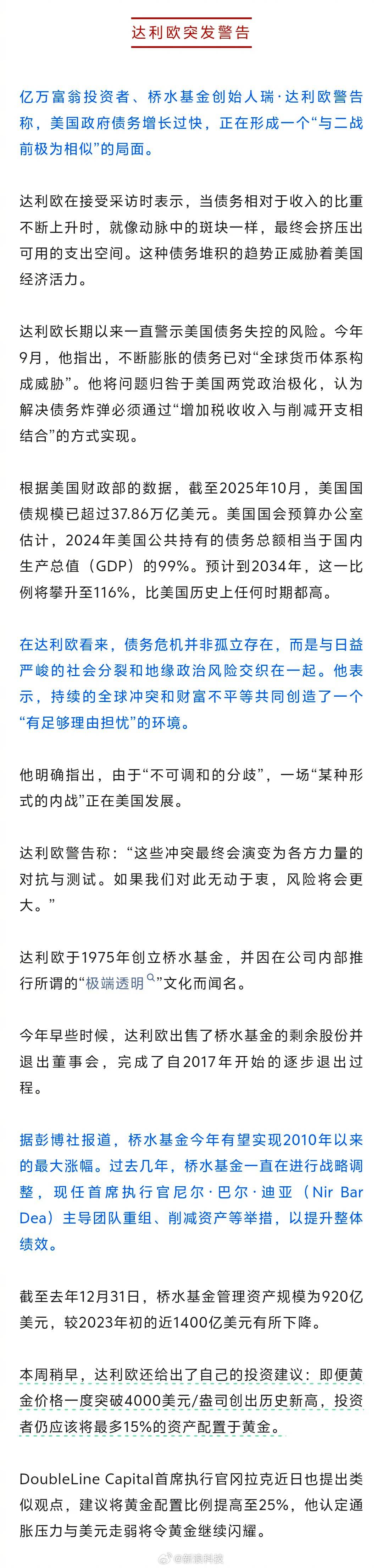 来源:新浪科技 【#美国政府债务突遭警告#】#桥水基金创始人称美债务状况非常危险# 在最新的采访中,桥水基金创始人瑞·达利欧警告称,美国政府债务的过快增长, 叠加日益激化的内外冲突,正在催生一种与二战前夕"非常类似"的氛围,对现有秩序构成严峻挑战。根据美国财政部的数据,截至2025年10月,美国国债 规模已超过37.86万亿美元。美媒报道称,在此之前,摩根大通CEO杰米·戴蒙、美联储主席杰罗姆·鲍威尔都认为"美债危机迫在眉睫"。达利欧预测,在特 朗普政府的领导下,"债务引起的心脏病发作"最多在两三年内就将爆发。(券商中国) 他明确指出,由于"不可调和的分歧",一场"某种形 式的内战"正在美国发展。 达利欧警告称:"这些冲突最终会演变为各方力量的 对抗与测试。如果我们对此无动于衰,风险将会更 大。" 达利欧于1975年创立桥水基金,并因在公司内部推 行所谓的"极端透明"文化而闻名。 今年早些时候,达利欧出售了桥水基金的剩余股份并 退出董事会,完成了自2017年开始的逐步退出过 程。 债规模已超过37.86万亿美元。美国国会预算办公室 估计,2024年美国公共持有的债务总额相当于国内 生产总值(GDP)的99%。 ...