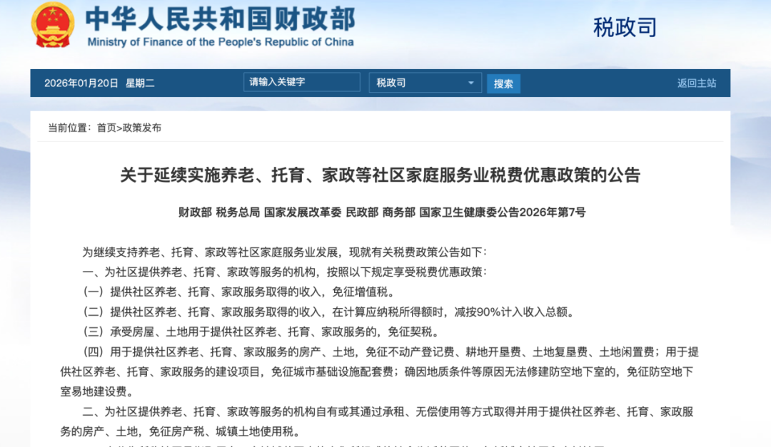 关于延续实施养老、托育、家政等社区家庭服务业税费优惠政策的公告公告2026年第7号