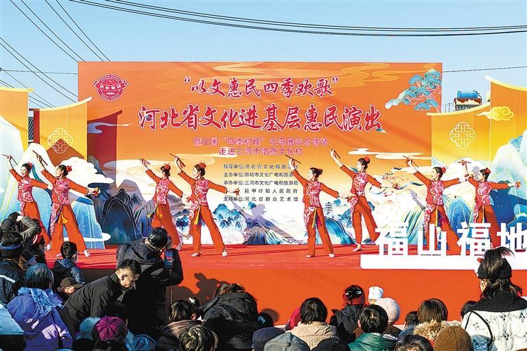 "福启新程·同心筑梦"篇章将活动氛围推向高潮,朗诵《福山赋》字字铿锵,歌曲《万疆》《幸福中国一起 走》旋律昂扬,演员们用饱满的热情,唱出了三河群众对美好生活的向往。 本次活动同步开启多平台线上直播,让乡土风情与浓浓年味飘向更广更远的地方,真正实现文化惠民、文化 乐民。三河市文化广电和旅游局副局长宗玉杰表示,本次村晚不只是一场文艺演出,更是融合文化传承与农 产品推介的乡村盛会。下一步,将坚持以群众为主角,搭建专业院团与民间爱好者共同展示的舞台,促成老 技艺与新农人深度对话,激活乡村内生文化动力,全力绘就文化有温度、产业有活力、乡村有希望的乡村振 兴新画卷。 图为舞蹈表演。本报通讯员 彭友青 摄 本次活动紧扣"福"文化主线,以"福韵三河·非遗传情""福润乡土·好物飘香""福启新程·同心筑梦"三个篇章层层 递进,让乡土文化与时代新风在舞台上精彩碰撞。"福韵三河·非遗传情"篇章里,《福山谣》《报花名》等经 典曲艺节目轮番上演,婉转唱腔里唱出三河新风尚;舞台旁的非遗展示区中,錾刻、传统核雕非遗代表性传 承人现场亮绝活儿,精湛技艺引得村民驻足围观、近距离体验,让非遗在基层落地生根。 "在家门口就能看这么精彩的表演,还能带 ...