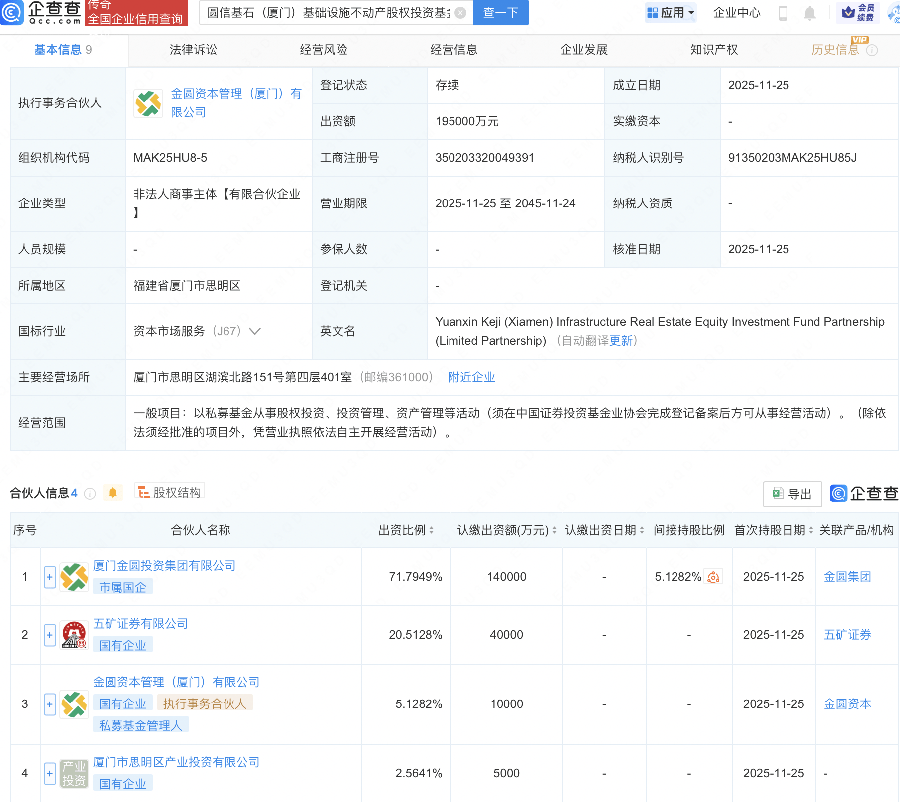 | 물 름 | | 合伙人名称 | 出资比例 ⇒ | 认缴出资额(万元) | | --- | --- | --- | --- | --- | | | + | 厦门金圆投资集团有限公司 | 71.7949% | 140000 | | | | 市属国企 | | | | 2 | | 五矿证券有限公司 | 20.5128% | 40000 | | | | 国有企业 | | | | | | 金圆资本管理(厦门)有限公司 | | | | 3 | | 国有企业 执行事务合伙人 | 5.1282% | 10000 | | | | 私募基金管理人 | | | | | | 言门士用叫反立山机次士阳八三 | | | 企查查APP显示,近日,圆信基石(厦门)基础设施不动产股权投资基金合伙企业(有限合伙)成立,出资额19.5亿元,经营范围包含:以私募基金从事股 权投资、投资管理、资产管理等活动。企查查股权穿透显示,该企业由厦门金圆投资集团有限公司、五矿证券有限公司等共同出资。 | 、ど合合 R可 全国企业信用查询 | | 圆信基石(厦门)基础设施不动产股权投资基ś 8 | 查一下 | | --- | --- | --- | --- | ...