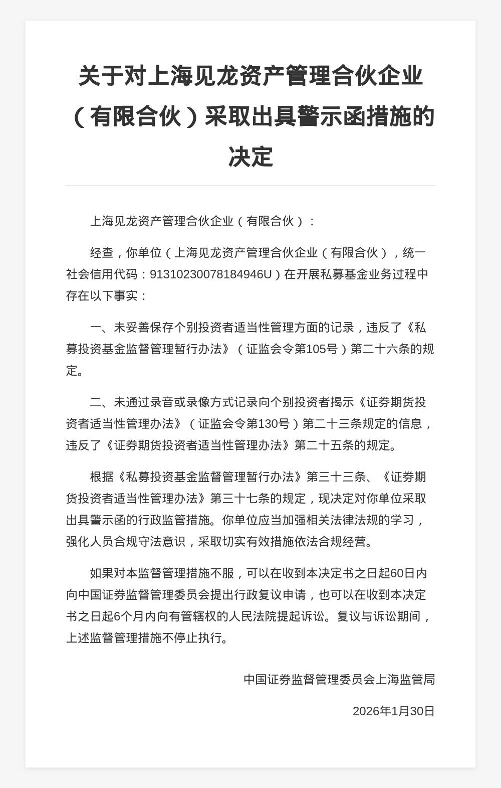 决定书显示,上海见龙资产管理合伙企业(有限合伙)在开展私募基金业务过程中存在以下事实: 蓝鲸新闻2月6日讯,近日,中国证券监督管理委员会上海监管局发布行政监管措施决定书,剑指上海见龙资产管理合伙企业(有限合伙)。 一、未妥善保存个别投资者适当性管理方面的记录。 二、未通过录音或录像方式记录向个别投资者揭示《证券期货投资者适当性管理办法》规定的信息。 以上行为违反了《私募投资基金监督管理暂行办法》《证券期货投资者适当性管理办法》的规定。中国证券监督管理委员会上海监管局决定对 上海见龙资产管理合伙企业(有限合伙)采取出具警示函的行政监管措施。 上述监督管理措施不停止执行。 2026年1月30日 中国证券监督管理委员会上海监管局 ...