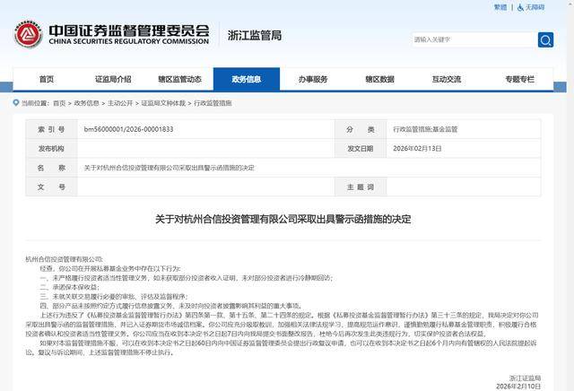 一、委托不具有基金销售业务资格的单位或者个人从事资金募集活动; 二、募资过程中存在误导性陈述; 三、部分产品未见合格投资者承诺、资产证明或收入证明,部分产品未对普通投资者告知、警示进行全过程录音或者录像; 四、部分产品未按合伙协议约定召开合伙人年度会议、未按合伙协议约定进行信息披露。 上述行为违反了《私募投资基金监督管理暂行办法》《证券期货投资者适当性管理办法》的规定。浙江证监局决定对杭州隆启投资管理有限公 司采取出具警示函的监督管理措施,并记入证券期货市场诚信档案。 蓝鲸新闻2月13日讯,近日,浙江证监局发布行政监管措施决定书,剑指杭州隆启投资管理有限公司。 决定书显示,杭州隆启投资管理有限公司在开展私募基金业务中存在以下行为: 如果对本监督管理措施不服,可以在收到本决定书之日起60日内向中 国证券监督管理委员会提出行政复议申请,也可以在收到本决定书之 日起6个月内向有管辖权的人民法院提起诉讼。复议与诉讼期间,上述 监督管理措施不停止执行。 浙江证监局 2026年2月12日 规行为,切头保护投资者言法仪品。 ...