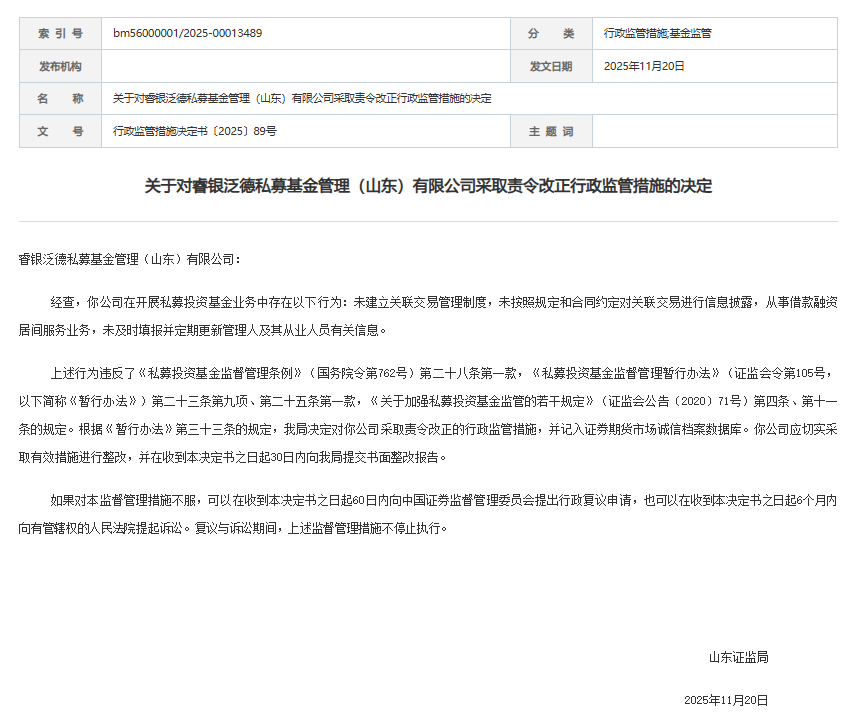 | 索 引 号 | bm56000001/2025-00013489 | से | ж | 行政监管措施;基金监管 | | --- | --- | --- | --- | --- | | 发布机构 | | 发文日期 | | 2025年11月20日 | | ਸਮ 夢 | 关于对睿银泛德私募基金管理(山东)有限公司采取责令改正行政监管措施的决定 | | | | | 号 文 | 行政监管措施决定书 (2025) 89号 | 主题词 | | | 蓝鲸新闻11月24日讯,近日,山东证监局发布了一则行政监管措施决定书,剑指睿银泛德私募基金管理(山东)有限公 司。 根据决定书,睿银泛德私募基金管理(山东)有限公司主要存在以下问题:未建立关联交易管理制度,未按照规定和合同 约定对关联交易进行信息披露,从事借款融资居间服务业务,未及时填报并定期更新管理人及其从业人员有关信息。 上述行为违反了《私募投资基金监督管理条例》《私募投资基金监督管理暂行办法》《关于加强私募投资基金监管的若干 规定》的相关规定。 针对以上问题,山东证监局决定对睿银泛德私募基金管理(山东)有限公司采取责令改正的行政监管措施,并记入证券期 货市场诚信档案数据 ...