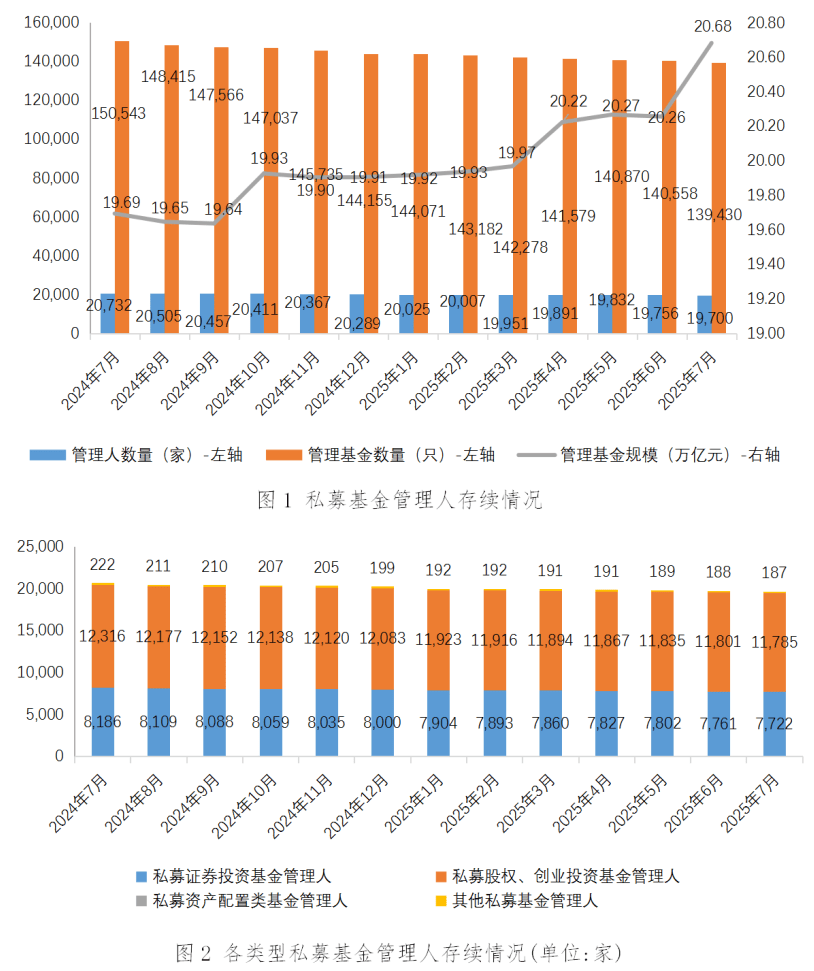 Group 1 - In July 2025, 22 institutions were registered through the AMBERS system, including 6 private securities investment fund managers and 16 private equity and venture capital fund managers. Additionally, 78 private fund managers were deregistered during the same month [1][2] - As of the end of July 2025, there were 19,700 active private fund managers managing a total of 139,430 funds, with a combined management scale of 20.68 trillion yuan [2][9] - The distribution of registered private fund managers is concentrated in Shanghai, Beijing, Shenzhen, Zhejiang (excluding Ningbo), Guangdong (excluding Shenzhen), and Jiangsu, accounting for 72.20% of the total, slightly up from 72.19% in June [4] Group 2 - The top six regions by fund management scale are Shanghai (52.69 billion yuan), Beijing (48.63 billion yuan), Shenzhen (19.70 billion yuan), Guangdong (excluding Shenzhen) (13.04 billion yuan), Jiangsu (11.91 billion yuan), and Zhejiang (excluding Ningbo) (9.78 billion yuan), together representing 75.31% of the total management scale [4] - In July 2025, 1,689 new private funds were registered, with a total new scale of 107.43 billion yuan [8] - The total number of active private funds as of the end of July 2025 was 139,430, with a total scale of 20.68 trillion yuan, including 82,059 private securities investment funds (5.88 trillion yuan), 30,193 private equity investment funds (11.01 trillion yuan), and 26,328 venture capital funds (3.46 trillion yuan) [9]