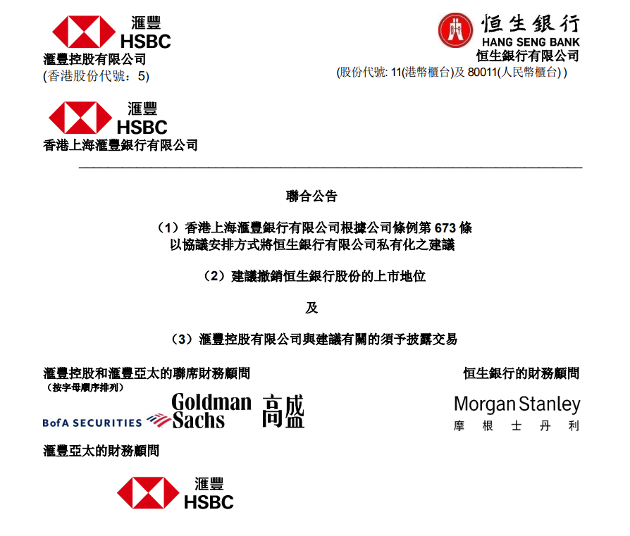 10月9日早间,汇丰控股及恒生银行联合发布公告,宣布汇丰亚太作为要约人,已要求恒生银行董事会向计划股东提呈私有化建议,交易估值约为2903亿 港元。 根据公告,此次私有化将根据公司条例第673条下的协议安排方式进行,若计划最终生效,恒生银行计划股份将全部注销,股东每股可获155港元现金对 价。 作为香港银行业的重要参与者,恒生银行此次私有化提议迅速引发市场广泛关注,两大金融品牌的未来协同与独立运营规划成为焦点。 10月9日,港股恒生银行盘初一度飙涨41%。截至收盘,恒生银行涨25.88%,报149.800港元/股,最新市值为2810亿港元。 | 恒生银行(0011) | < W | | | --- | --- | --- | | 闭市 10-09 16:08:34 通 | | | | 19.6 149.800 额 84.4亿 股本 18.76亿 市盈 | | 万得 盘口 | | 换 2.99% 市值 2810亿 市净 1.65 30.800 25.88% | | | | 人民币柜台 137.000 28.100 25.80% | | | | 月K 电子 五日 日K | 分时 | (0) | | 均价:150. ...