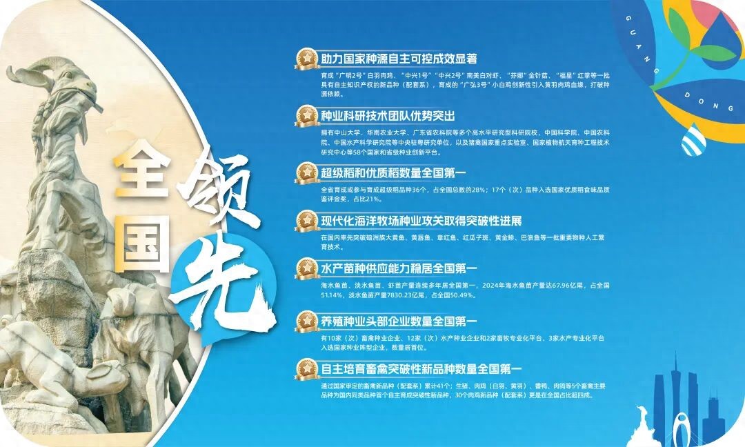 岭南大地,稻香鱼肥 广东不仅是经济第一大省 也是农业科技创新的高地 深入实施种业振兴行动 大力推动"粤强种芯"工程 一场以种业为引擎的农业科技革命 正悄然改变着这片热土的农业基因 广东种业成绩单 资源保护 筑牢36.8万份种质根基 广东全面摸清农业种质资源家底 新收集农作物种质资源8437份 新发现阳西、罗定、陆丰 3个野生稻分布点 开展第一次全国水产养殖种质资源普查 持续开展珠江流域水产种质资源的 抢救性收集和保育工作 收集保育月鳢、纹唇鱼、马口鱼等 品种种质资源 率先完成省级农业微生物种质资源普查 获取资源信息超6.9万份、物种5652种 发现新物种107个 全省保存的农业种质资源 总量达到36.8万份 保存种类和数量均位居全国前列 精准鉴定方面 广东构建了涵盖 15000份水稻 3700份蔬菜(瓜类)的 种质资源DNA分子指纹图谱库 构建了45个生猪、肉鸡、 水禽品种(配套系)等畜禽品种 DNA指纹特征库 实现种质资源和畜禽地方品种 精准分子鉴别 广东地方畜禽种质资源 找回原认定灭绝的中山麻鸭 建成28个国家和省级 农作物种质资源圃(专业库、原生境保护区) 35个省级畜禽遗传资源保种场(区、库) "国家 ...