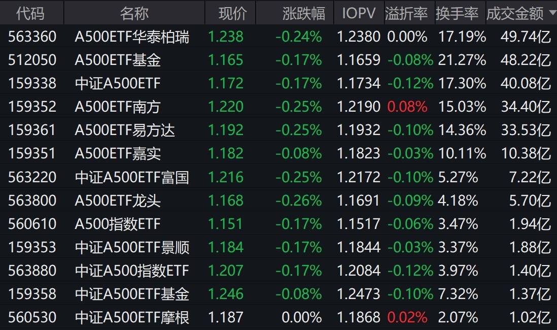 | 有券商表示,科技+周期的双轮驱动主线仍将延续,在全球科技大周期的共振下,科技的相对盈利与景气优势有望延续。而周期行业在"反内卷"预期下,辅 | | --- | | 以PPI边际修复与再通胀的交易预期同样也大有可为。 | 三大指数早盘涨跌不一,沪指窄幅震荡,中证A500指数下跌0.18%。 从板块来看,算力硬件概念再度爆发,福建板块延续强势,零售板块表现活跃;下跌方面,海南本地股集体调整,有色金属板块震荡走弱。 截至上午收盘,场内跟踪中证A500指数的ETF小幅下跌。其中,有13只中证A500相关ETF成交额超1亿元,3只超40亿元。A500ETF华泰柏瑞、A500ETF基 金、中证A500ETF早盘成交额分别为49.74亿元、48.22亿元、40.08亿元。 | 代码 | 名称 | 现价 | 涨跌幅 | IOPV 溢折率 换手率 成交金额 | | | --- | --- | --- | --- | --- | --- | | 563360 | A500ETF华泰柏瑞 | 1.238 | -0.24% | 1.2380 0.00% 17.19% 49.74亿 | | | 512050 | A500ETF基金 ...