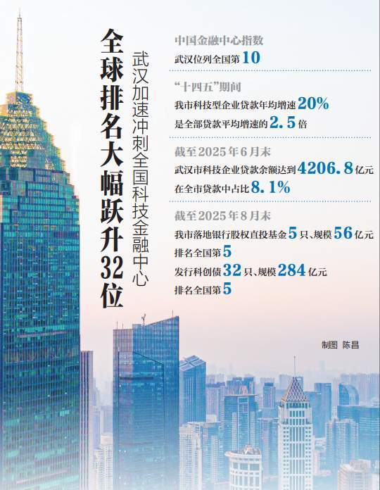 全市7000家科技企业的全覆盖;在资本层面,规模达200亿元的市科技创新母基金已设立, 将有力引导社会资本共同投向科技创新前沿领域。 "所有这些举措,关键都指向同一个核心目标——构建'科技—产业—金融'的良性循 环。"该负责人向调研组表示,下一步将积极推动金融机构对早期科技企业建立更具"耐 心"的风险评估与容忍机制,全力完善知识产权质押融资等配套机制,真正破解难题,让企 业的"知产"顺利转化为发展的"资产"。 近日,武汉市委金融办相关负责人向调研组展示的一组数据,清晰勾勒出这座城市在金 融赛道上的加速态势。 编辑:熊展平 据介绍,最新数据显示,在2025年第16期"中国金融中心指数"中,武汉位列全国第10; 在2025年"全球金融中心指数"中,武汉排名第79位,相较"十三五"末大幅提升了32位,这标 志着武汉作为全国首批科技金融改革创新实验区,通过金融创新赋能科技创新的路径越走越 坚实。 调研中长江日报记者感受到,武汉的科技金融工作正迈向一个更系统、更深入的高质量 发展阶段。以今年6月出台的《加快建设全国科技金融中心行动方案》为总纲领,武汉打造 全国科技金融中心的工作进入了"施工高峰期"。 据介绍,武汉将重点 ...