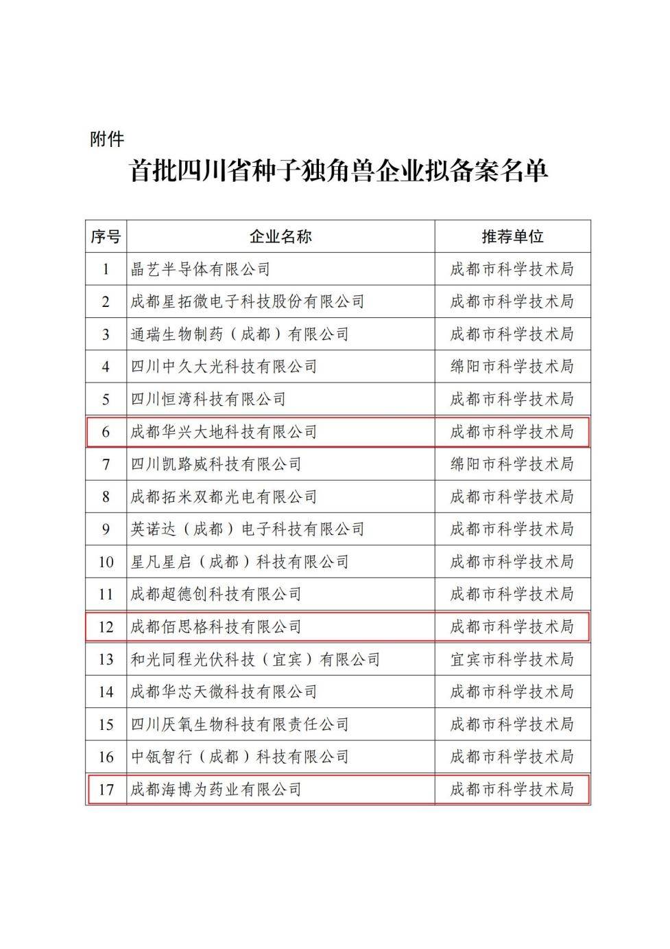 成都科服集团参股基金投资的3家企业入选 首批四川省种子独角兽企业拟备案名单