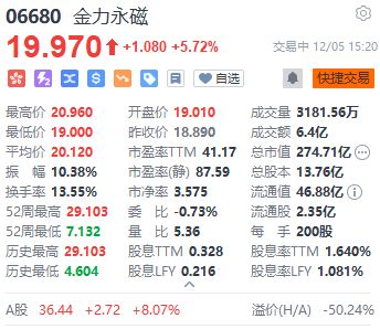 来源:上海证券报·中国证券网 上证报中国证券网讯(记者 何治民)12月5日,金力永磁午后拉升,一度涨超10%,截至15时20分,金 力永磁H股股价回落至19.97港元/股,涨5.72%;A股涨8.07%,报36.44元/股。 | 06680 金力永磁 | | | | --- | --- | --- | | 19.970 +1.080 +5.72% | | 交易中 12/05 15:20 | | * 2 × × 8 = 0 目 ♥ 自选 | | ● 原能交易 | | 最高价 20.960 | 开盘价 19.010 | 成交量 3181.56万 | | 最低价 19.000 | 昨收价 18.890 | 成交额 6.4亿 | | 平均价 20.120 | 市蕴率 TM 41.17 | 总市值 274.71亿 … | | 振 幅 10.38% | 市盈率(静) 87.59 | 总股本 13.76亿 | | 换手率 13.55% | 市净率 3.575 | 流通值 46.88亿(i) | | 52周最高 29.103 | 季 比 -0.73% | 流通股 2.35亿 | | 52周最低 7.132 | 量 比 5.3 ...