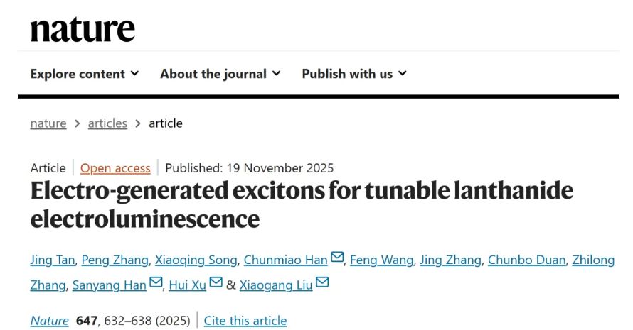 △《自然》网站文章截图 稀土是不可替代的战略资源,被誉为"工业维生素"。我国在稀土资源储量和冶炼上具有优势,但在终端高端功能材料与器件方面仍面临产业瓶颈。镧系掺杂 纳米晶虽具备色纯度高、稳定性好等作为理想发光材料的优异特性,却因固有的"绝缘"特性无法被电流直接点亮,其高价值光电应用长期受阻。 近日,黑龙江大学、清华大学和新加坡国立大学合作完成的突破性研究成果在《Nature》正式发表,成功攻克绝缘性稀土纳米晶的高效电致发光这一世界难 题。该研究为实现我国稀土资源从"原料出口"向"高附加值技术输出"的战略转型提供了关键核心技术支撑。 面对这一制约稀土材料迈向高端应用的瓶颈,研究团队开创性地提出有机半导体敏化策略,以功能化有机配体作为"光电桥梁",成功将能量精准高效地传递 给绝缘稀土纳米晶,实现了电流驱动下的高效发光。 △有机-无机杂化发光单元设计与能量传递机制示意图(研究团队供图) 该技术展现出巨大应用潜力:电致发光器件效率提升76倍,并可在单一器件中通过稀土离子调控实现全光谱发光。这标志着我国在稀土高端光电应用领域取 得关键突破,为发展自主可控的超高清显示、近红外通信、生物医疗等新一代信息技术提供了全新材料体 ...