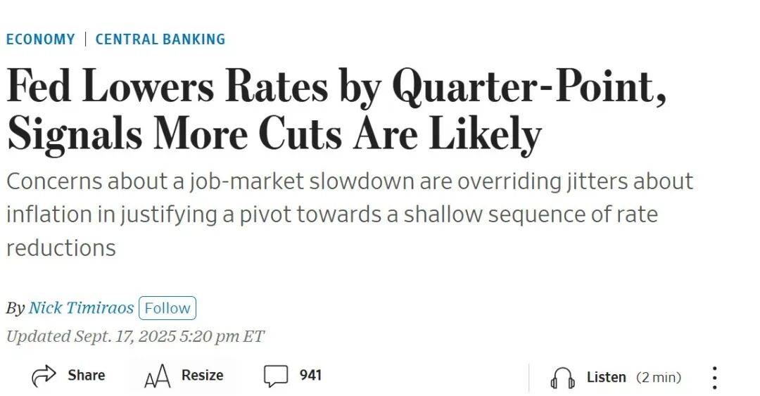 美联储在9月17日宣布降息0.25个百分点,这是九个月来的首次动作,并暗示年内或将继续降息。此次政策转向的背后,是对就业市场放缓的担忧超过了 对通胀的顾虑。对于美国EB-5而言,这一宏观经济环境的变化不仅影响整体融资与就业前景,更为乡村项目的发展提供了更多的机遇。 美联储降息释放稳就业信号 美联储此次降息,将基准利率区间下调至4%—4.25%,为近三年来的最低水平。 此次降息预计将为信用卡欠款的消费者,以及持有浮动利率债务的小型企业带来立竿见影的缓解。抵押贷款利率和其他长期借贷成本对单次降息敏感度比 较低,但在市场普遍预期美联储将持续降息的背景下,这些利率近几周也会出现下降。 多数官员预计在10月和12月还会继续降息,意味着美国可能进入连续降息的阶段。这一决策的主要考量是近期就业市场走弱:新增岗位锐减,失业率升至 与此同时,通胀问题仍然存在,但美联储判断其可控性强于就业风险。尽管部分商品和服务价格仍处于高位,但相比劳动力市场可能出现的裂痕,通胀被 认为是相对"可管理"的挑战。 因此,美联储在声明中明确表示未来降息的可能性正在增加。这标志着美联储的政策重心已明显偏向"稳就业",即在就业和通胀的权衡中更倾向于保护 ...
