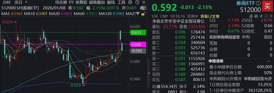 1月7日,A股早盘低开,券商板块跌幅居前,顶流券商ETF(512000)场内价格现跌2.15%。昨日板块 回调日,资金逢跌加仓券商ETF(512000)1.56亿元。 | 综合解 F9 前震权 超级酷加 面线 工具 @ 2 >> | | | | | 劳而ETF (D | | 分时 多日 · | | --- | --- | --- | --- | --- | --- | --- | --- | | 512000.SH 药商ETF] 2026/01/08 收0.592 幅 2.15%(-0.013) 开0.601 20 MAS 0.596T MA10 0.5901 MA20 0.5821 MA60 0.5851 MA120 0.5901 MA25 0.5901 MA25 0.5 | 0.592 -0.013 -2.15% | | | | 512000 | | | | SSE CNY 10:18:16 交易中 查看L2全F | | | | | | | | | 净值走势华宝中证全都亚得公 | | | | 72% 250H DE | | | 0.625-> | | 0.620 | 委比 25.71% 委统 135535 ...