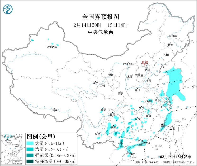 来源:中央气象台 江南西部华南西部等地部分地区有大雾天气 预计,2月14日夜间至15日早晨,江苏南部、浙江北部、湖南中南部、江西西部、贵州中西部、广西中西部等地有能 见度不足1公里的大雾,局地有能见度不足200米的强浓雾。此外,黄海中部和南部、东海西北部和西南部、长江口附 近海域、成山头、上海港、浙闽交界沿岸海域、北部湾北部海域、琼州海峡、雷州半岛东部附近海域、广东中西部沿 海海域将有能见度不足1公里的大雾。 中央气象台 14 日 18 时继续发布大雾黄色预警。 14日夜间至16日白天,华北南部、汾渭平原等地的部分地区大气扩散条件总体较好,部分地区有轻度霾天气。16日夜 间起,华北中南部、黄淮、江淮、汾渭平原、四川盆地等地大气扩散条件逐渐转差,有轻至中度霾。 具体预报如下: 京津冀及周边区域 华中区域 14日夜间至16日白天,区域大部地区大气扩散条件较好,无持续性霾天气。16日夜间起,区域大气扩散条件逐渐转 差,有轻至中度霾。 珠三角区域 14日夜间至16日白天,区域中南部大气扩散条件总体较好,区域南部局地有轻度霾天气。16日夜间起,区域大气扩散 条件逐渐转差,有轻至中度霾。 长三角区域 14日夜间至16日, ...