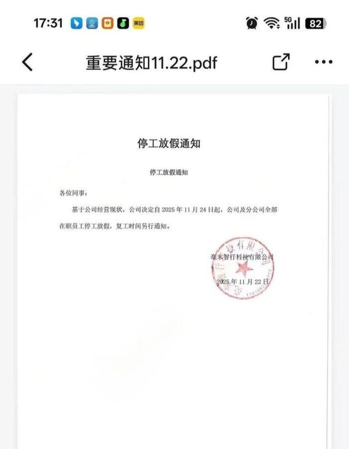 总部位于北京的智驾公司毫末智行科技有限公司(以下简称"毫末智行")突然被曝出停摆的消息。 11月24日,多名知情人士告诉蓝鲸汽车记者,毫末智行11月22日突然在公司内部群发布"停工放假通 知",称基于公司经营现状,决定自24日起,公司及分公司全部在职员工停工放假,复工时间另行通 知。 "仅一纸通知,甚至没有说明停工期限,没有说明薪资发放、社保公积金缴纳以及赔偿方式等具体情 况。"多名知情人士对蓝鲸汽车记者表示,现在公司还有将近300人,北京、保定等地都有员工,但目前 钉钉已不能考勤打卡。 红星资本局采访到的员工称,公司领导层没有对该通知作出任何解释,随后公司群被禁言。有北京员工 称,公司已拖欠两个月工资,目前没有管理层与员工沟通后续赔偿及安排。 据内部员工杨明(化名)向新黄河记者证实,停工通知下达得非常突然——邮件在周五临近下班时发 出。为防止后续物业封楼导致无法取出个人物品,不少员工在周末赶回公司打包。 这一内部信显示,彼时,毫末智能驾驶产品已落地搭载超过20款车型,其自动配送车小魔驼将行业单车 平均价格从几十万元降到了几万元,为多个物流场景配送了接近90万单。 但也正是在去年11月,毫末智行就曾传出遭遇经 ...