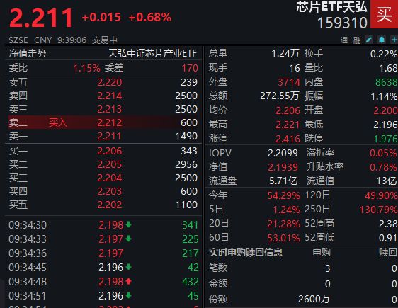 10月14日,A股三大指数集体高开,算力方向上涨。相关ETF方面,芯片ETF天弘(159310)涨 0.68%;成分股方面,佰维存储涨超11%,北京君正、江波龙、兆易创新等跟涨。科创综指ETF天弘 (589860)上涨0.68%;成分股中,壹石通、炬芯科技涨超11%,骄成超声等涨幅居前。截至发稿, Wind金融终端显示,芯片ETF天弘(159310)获2600万份净申购。 | | | 2.211 +0.015 +0.68% | | | 芯片ETF天弘 159310 | 本 | | --- | --- | --- | --- | --- | --- | --- | | SZSE CNY 9:39:06 交易中 | | | | | | 通 融 / ● + | | 净值走势 | | | 天弘中证芯片产业ETF | 总量 | 1.24万 换手 | 0.22% | | 要比 | | 1.15% 变差 | 170 | 现手 | 16 里比 | 1.68 | | 四 | | 2.220 | 239 | 外盘 | 3714 内盘 | 8638 | | 英国 | | 2.214 | 2500 | 总额 | 272.55万 振幅 ...
