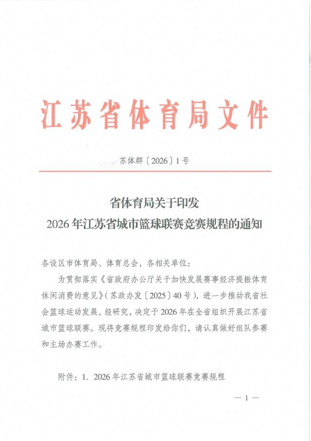 (来源:荔枝新闻) 转自:荔枝新闻 2. 2026年江苏省城市篮球联赛报名表 3. 2026年江苏省城市篮球联赛自愿参赛承诺书 -2 - 附件 1 2026 年江苏省城市篮球联赛竞赛规程 一、组织单位 (一)主办单位:江苏省体育局 江苏省体育总会 (二)承办单位:各设区市体育局 各设区市体育总会 江苏省篮球运动协会 江苏省体育产业集团 (三)协办单位:各设区市篮球协会 二、比赛时间 (一)常规赛:2026年9月-11月; (二)季后赛:2026年11月-12月; (三)比赛原则上安排在周五、六、日,每周最多安排6场 比赛。如遇特殊情况,联赛组委会有权对原定赛程进行调整。 三、比赛地点 (一)常规赛:在主场球队所在设区市(含其所辖县市区) 进行,比赛主场馆为不低于2千人座位,符合竞赛组织和电视、 网络转播要求的室内体育馆。 -3- 四、参加办法 (一)参赛单位:各设区市(可委托所辖县市区)组建一支 球队参赛,队名统一为城市名称,如"南京队"。 (二)参赛人员 1. 领队:由设区市体育局分管负责同志担任,兼任赛风赛纪 监督员。 2. 教练:必须持有体育部门(含省级以上篮球协会)颁发的 篮球项目教练员证书或人社部门 ...