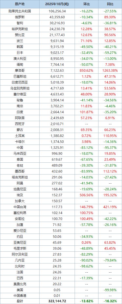 海关统计数据在线查询平台公布的数据显示,中国2025年10月精炼铜进口量为323,144.72吨,环比下降 13.62%,同比下降16.32%。 刚果民主共和国是第一大进口来源地,当月从刚果民主共和国进口精炼铜106,256.34吨,环比减少 16.22%,同比减少27.55%。 俄罗斯是第二大进口来源地,当月从俄罗斯进口精炼铜43,359.60吨,环比下降10.34%,同比增长 89.30%。 | 塞拉利品 | 102.14 | 100.75% | | | --- | --- | --- | --- | | 安哥拉 | 100.70 | 100.49% | -42.22% | | 加蓬 | 71.92 | -57.78% | -26.16% | | 爱沙尼亚 | 53.65 | -- | -- | | 超目 | 50.06 | -34.93% | -- | | 亚美尼亚 | 45.69 | 0.26% | 63.82% | | 毛里求斯 | 39.06 | -48.89% | 45.45% | | 阿尔及利亚 | 27.83 | -82.29% | -- | | 几内亚 | 25.28 | -90.02% ...